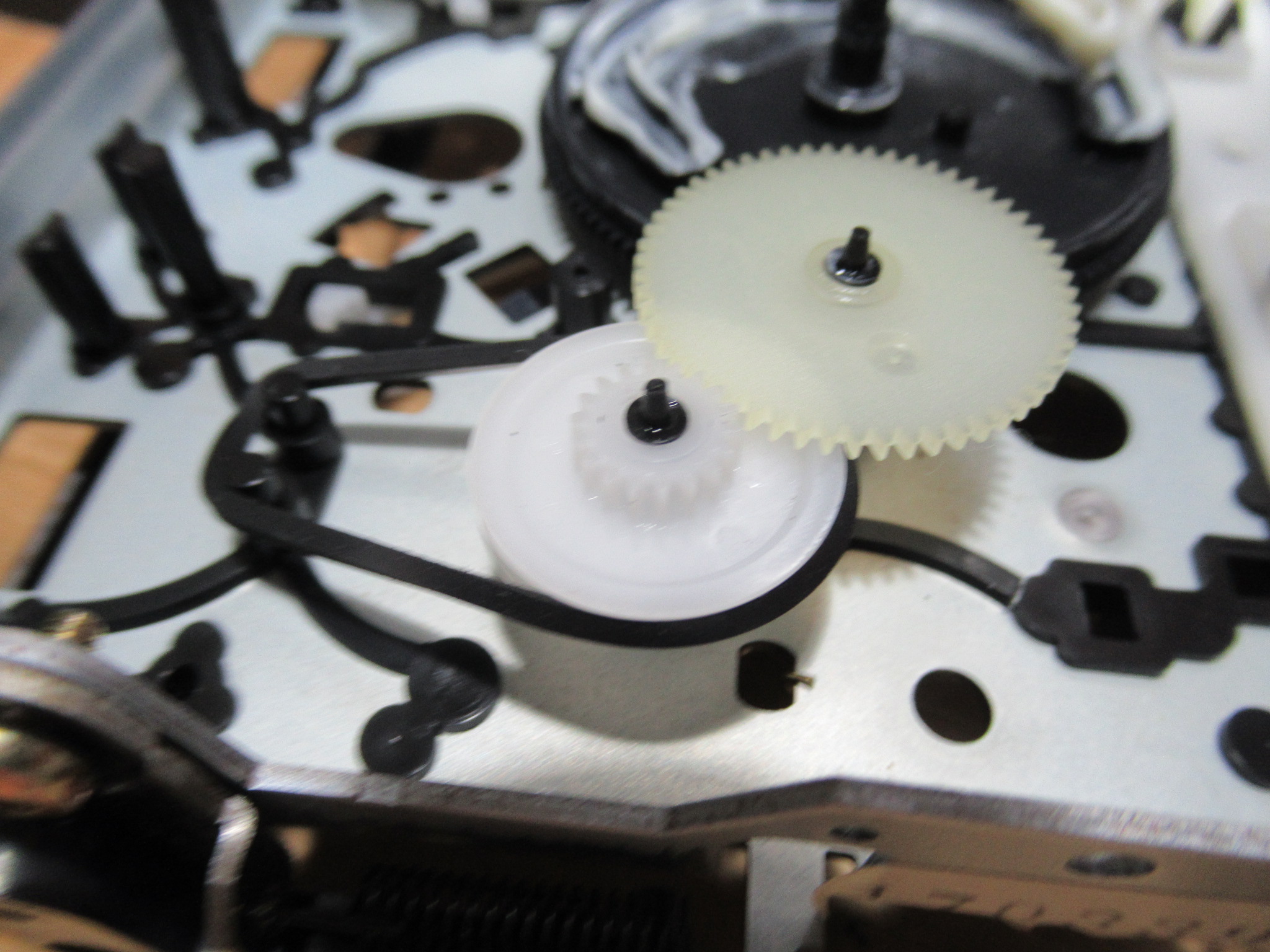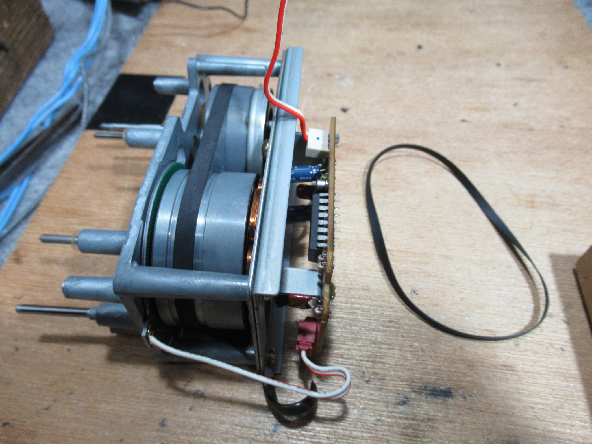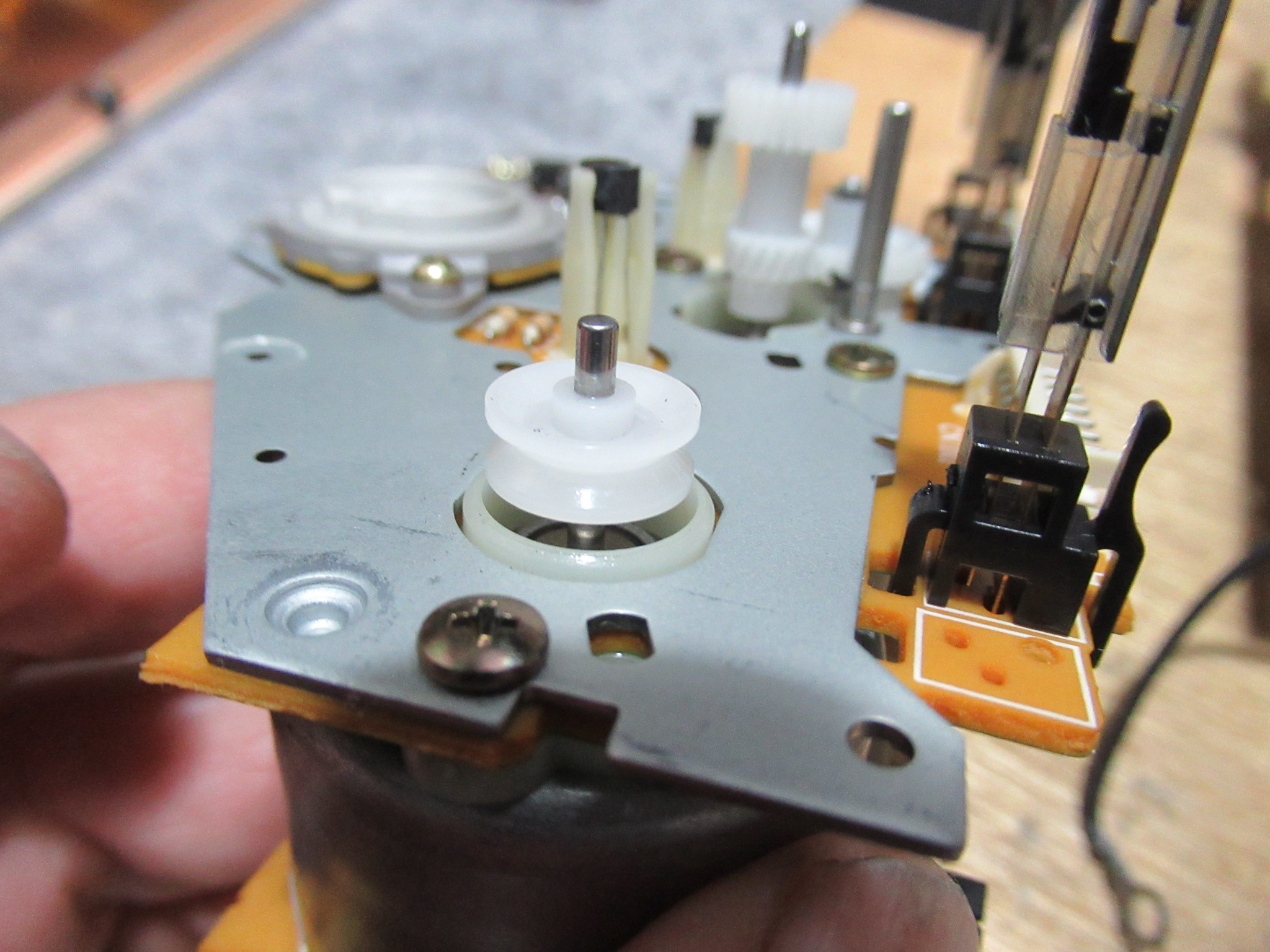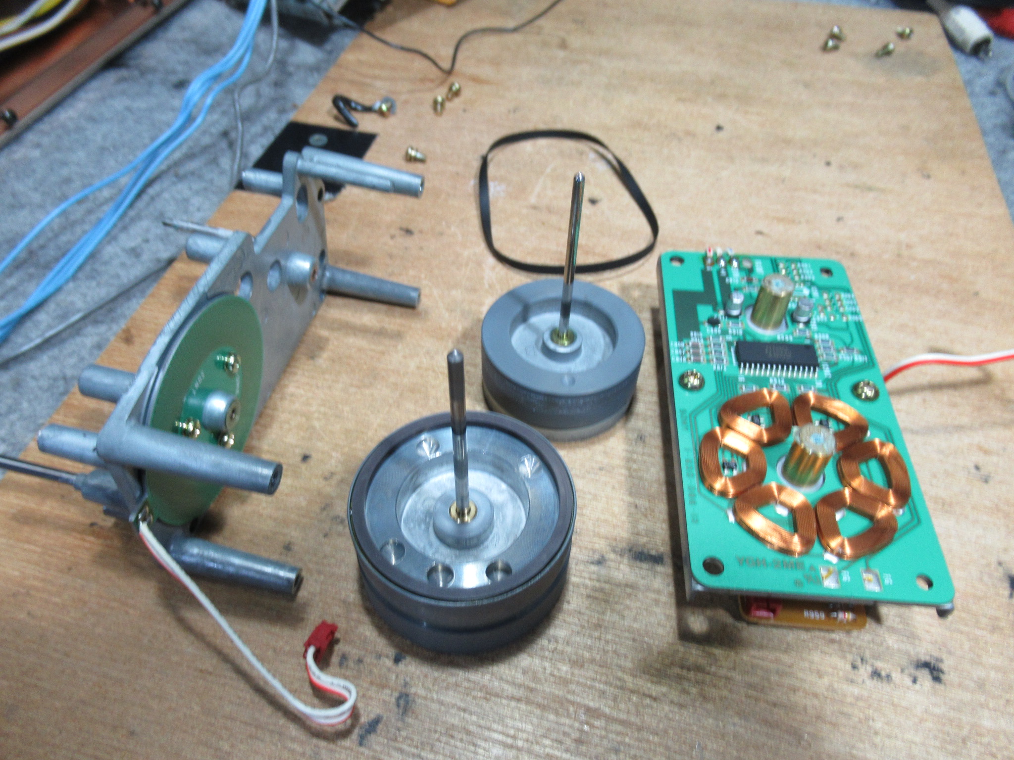 基板面の電解コンデンサーを交換し、新しいベルトを掛けて組み立てます。