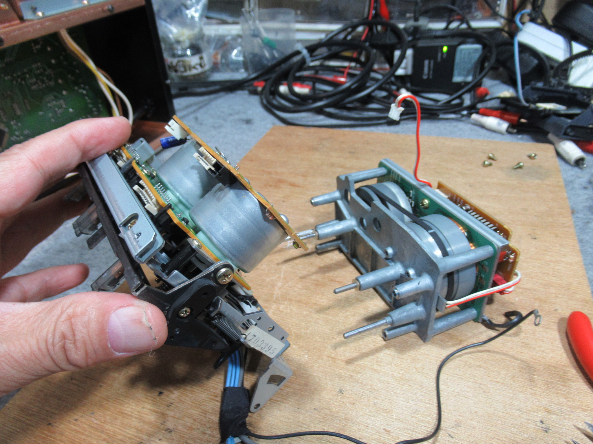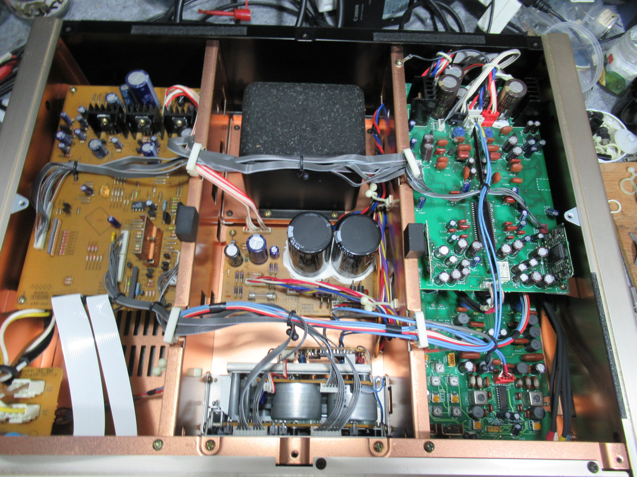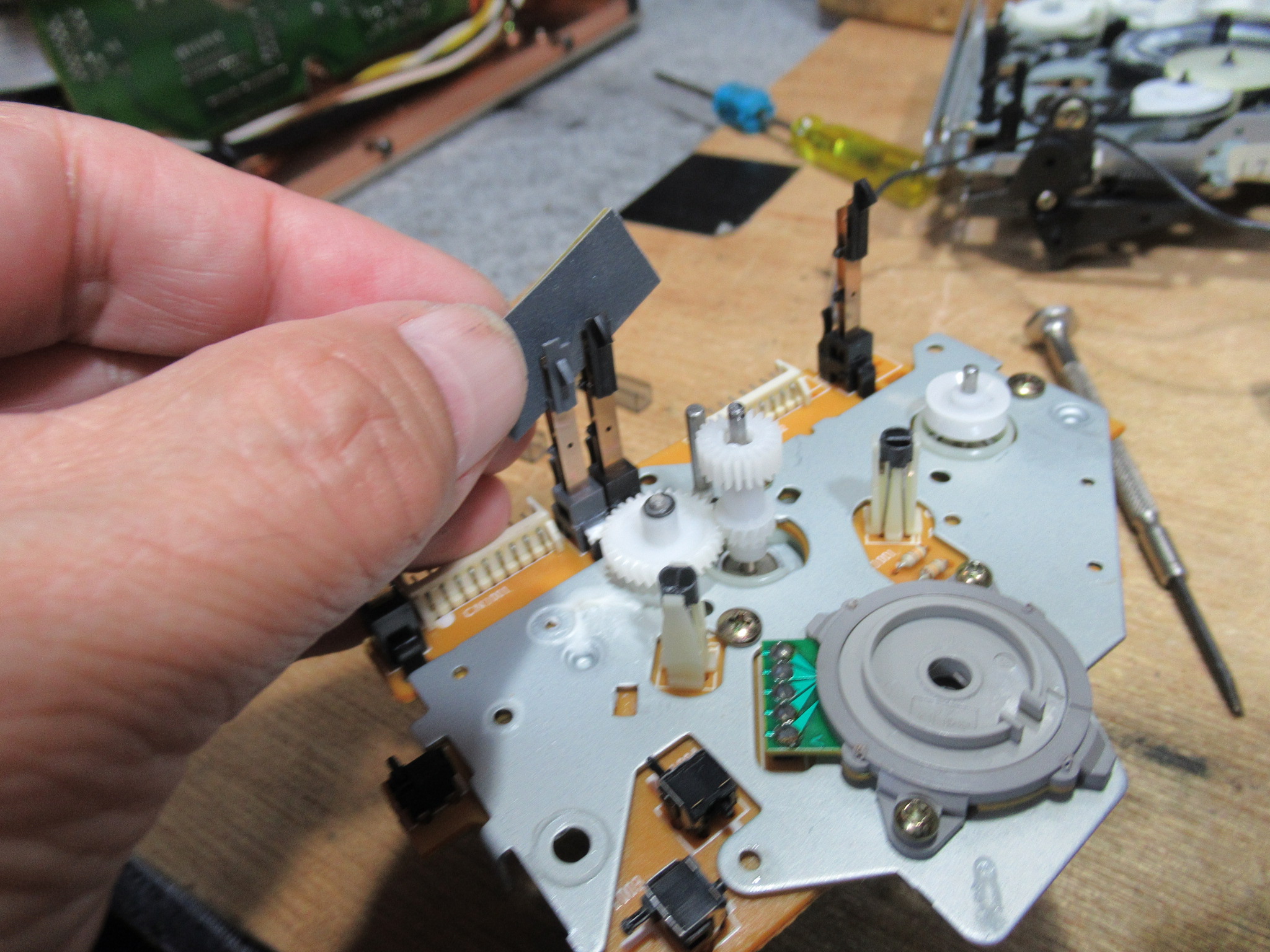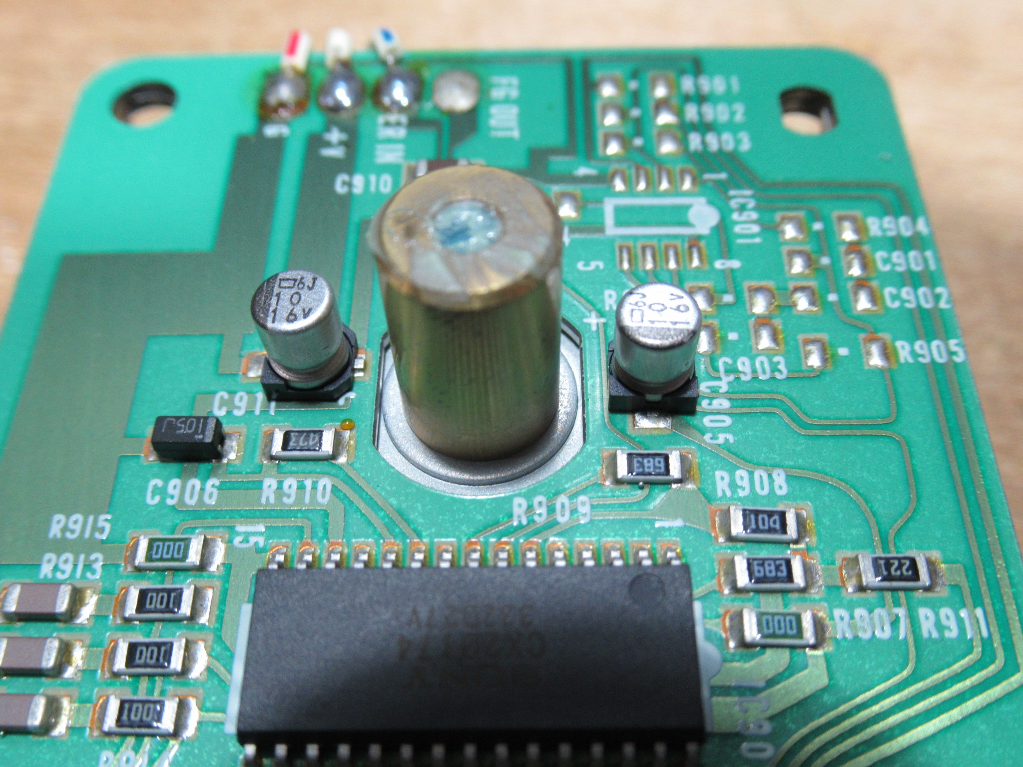 基板面の電解コンデンサーを交換し、新しいベルトを掛けて組み立てます。