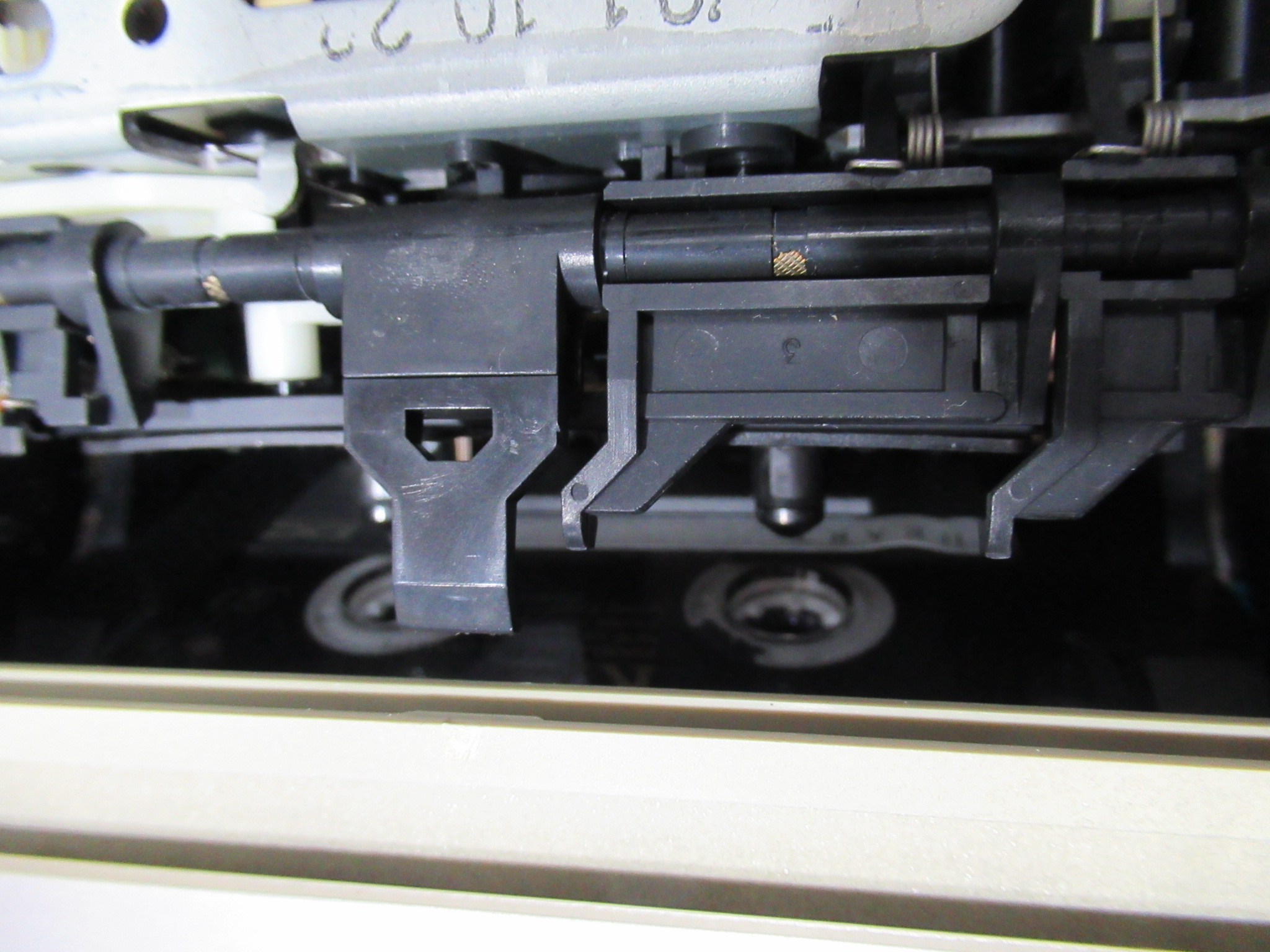 テープが閉じ込められたままです。上から覗くと、テープがトレイとデッキメカに挟まれて引っ掛かっています。そこで、隙間からドライバーでテープを少し突いてやると、