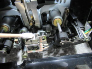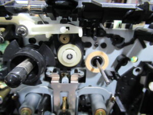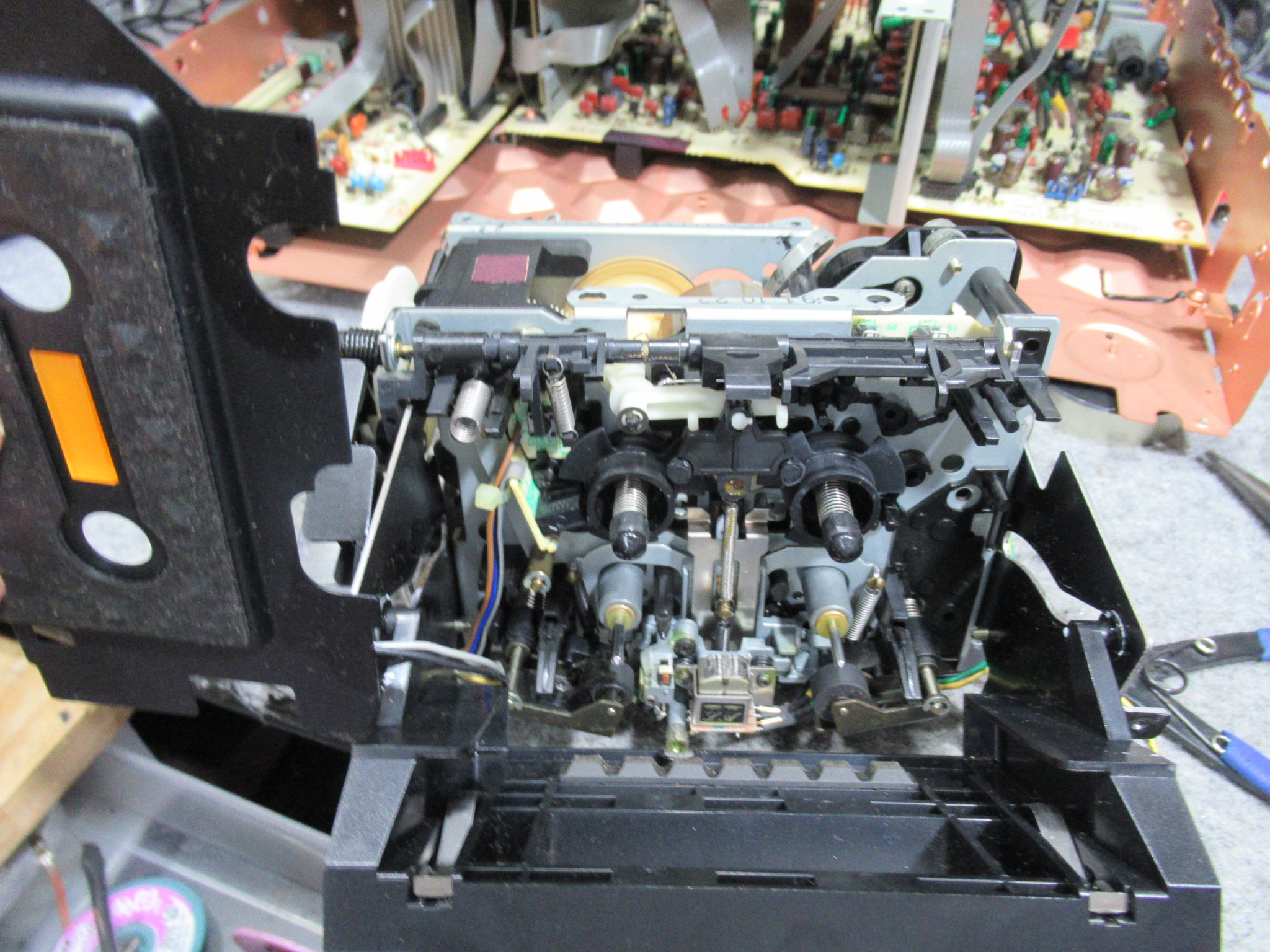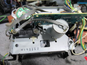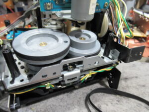 背面です。キャプスタンモーターは過去に交換済みのようですが、何故かバックプレートが取り付けられていません。基板がグラグラしていましたので、接着剤を処置しました。