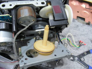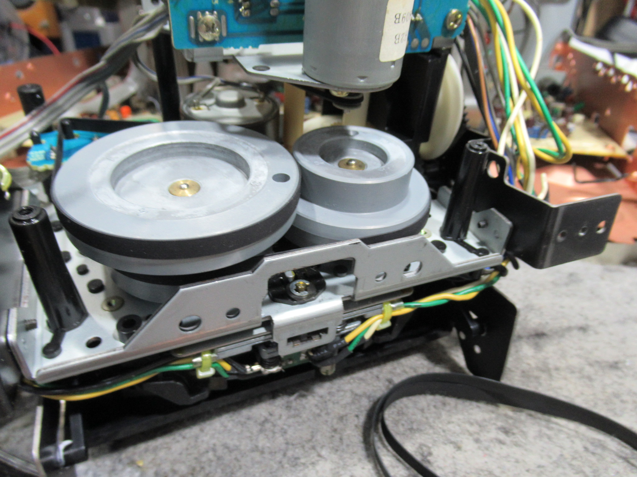 カバーを開けました。通常は、カムモーターのプーリーを指で回すとトレイが開くのですが、何かが引っ掛かってプーリーが回りません。