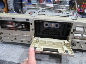 当ブログ初登場のPIONEERの高性能・高級カセットデッキT-1000Sです。 パイオニア製のデッキは、他メーカーと比べると、独自性が強いという印象があります。 電動のトレイが閉まりません。 カバーを …
