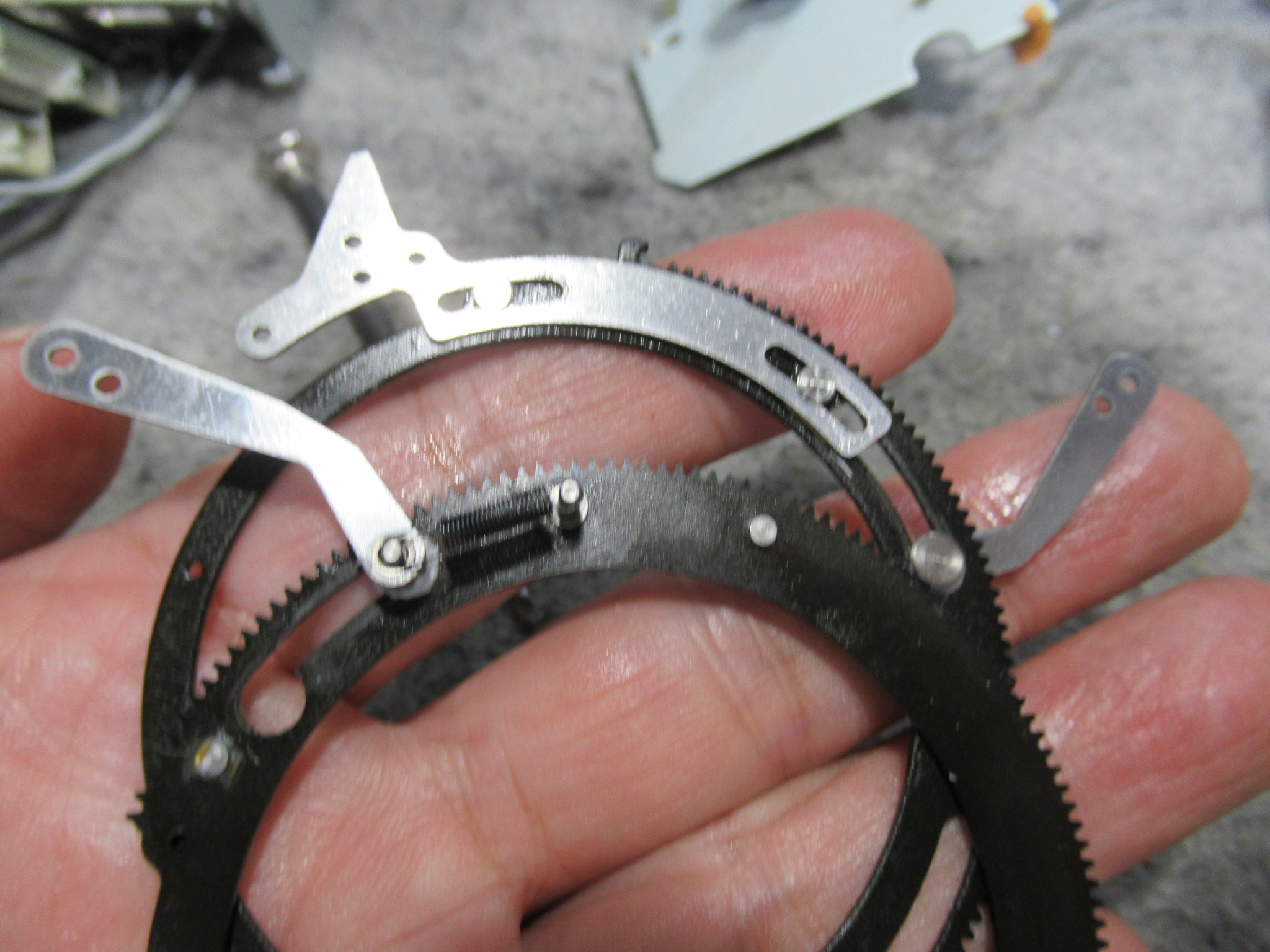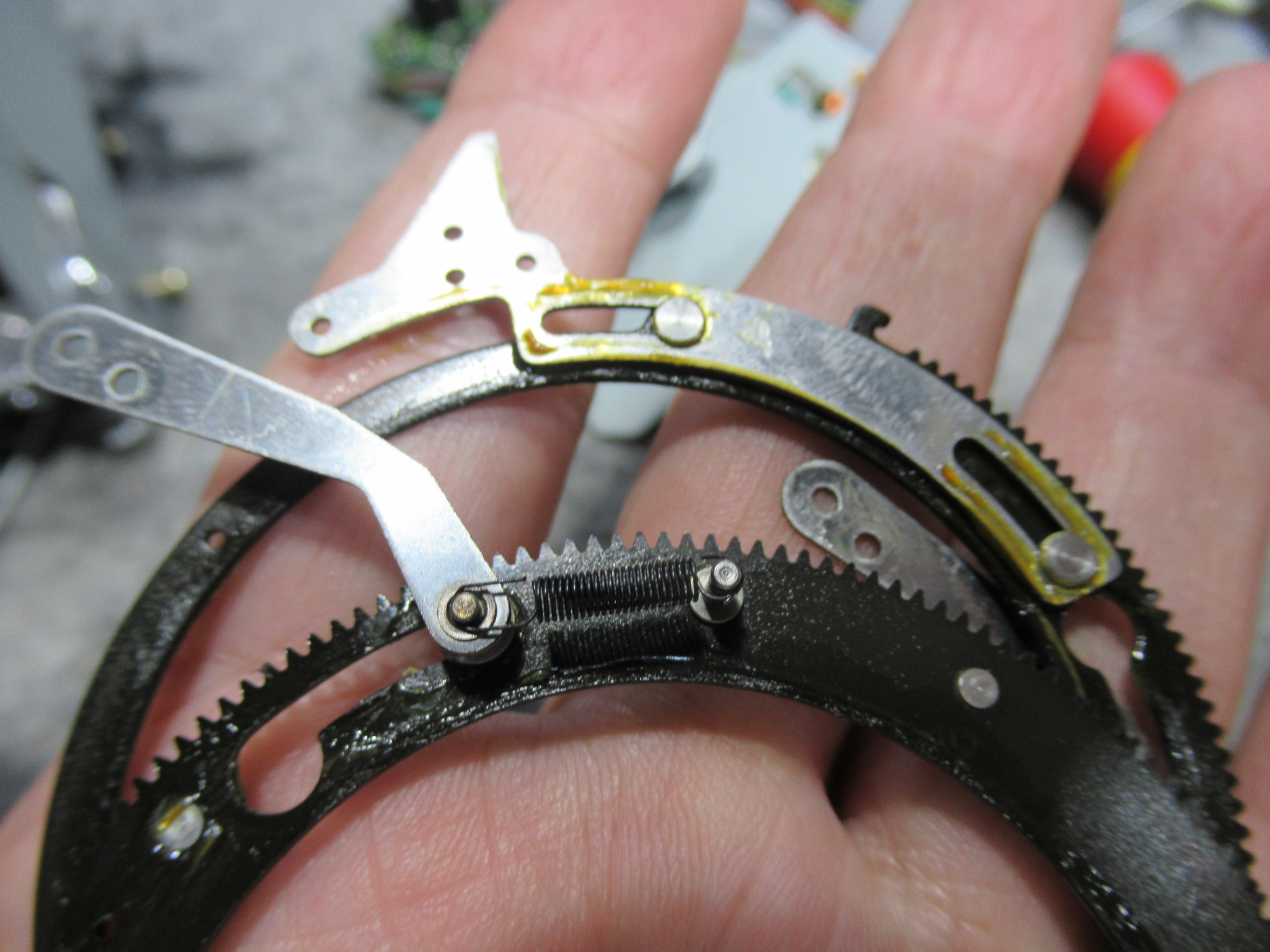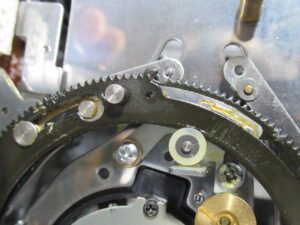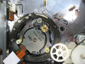 可動式テープガイドを駆動するリングギヤです。製造時に処置されたと思われるグリスが固まっています。