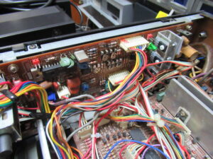 点検を行うと、早送り巻き戻し後に異状にバックテンションが掛かることがあることがわかりました。リールユニットの調整不良があったようですので、必要な処置を行いました。ただし、30分経過後に発生するというのはそのままの状況です。このままやみくもに点検を進めても一向に前に進みませんので、まずは、不具合の原因が、モーター基板にあるのか、メカ本体にあるのかを確定することにしました。