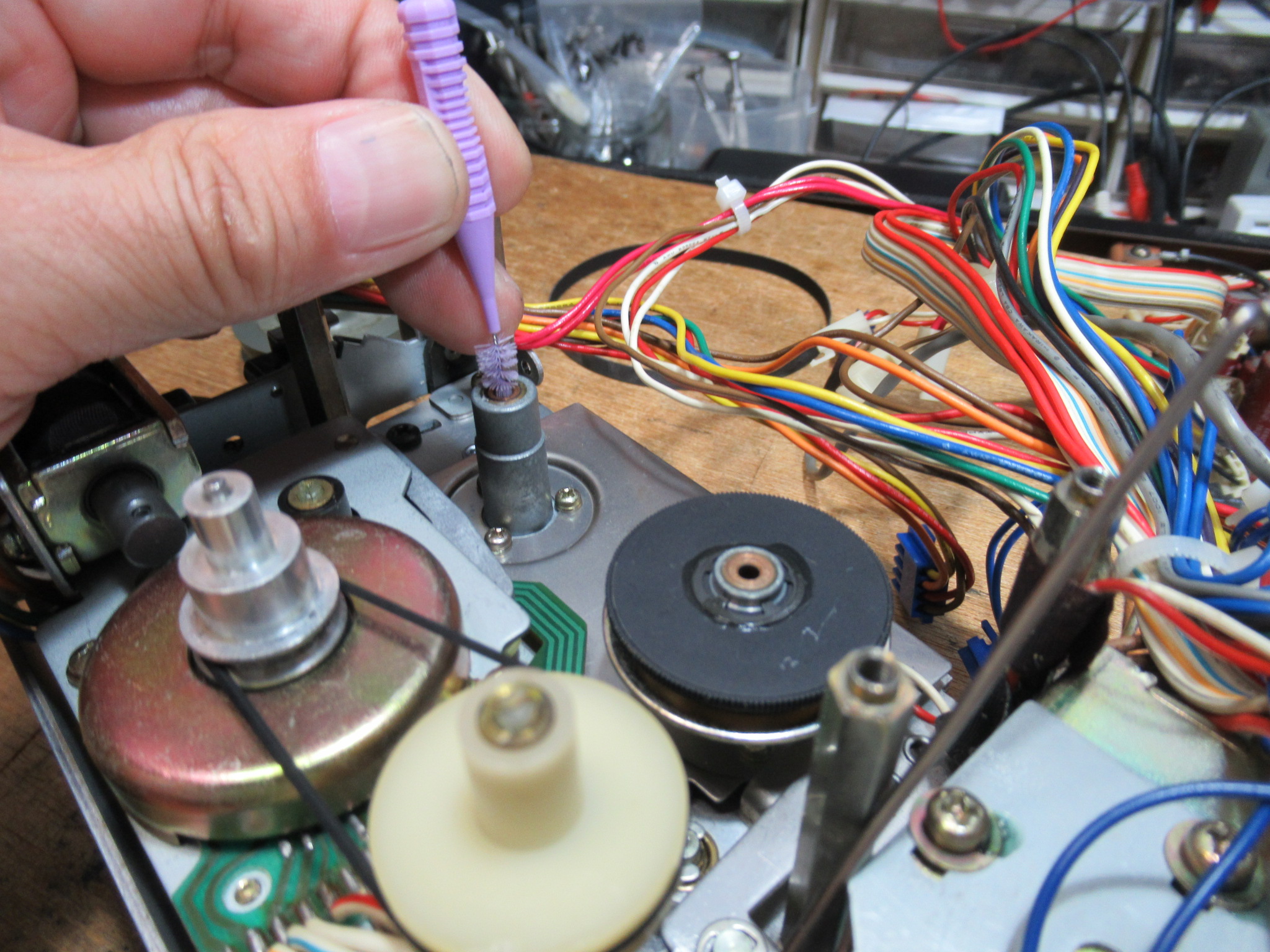 メカを降ろして、キャプスタンの貫通部(軸受け)を清掃し、グリスを処置します。また、モーターのトルクを強めるために、電圧を強めることにしました。