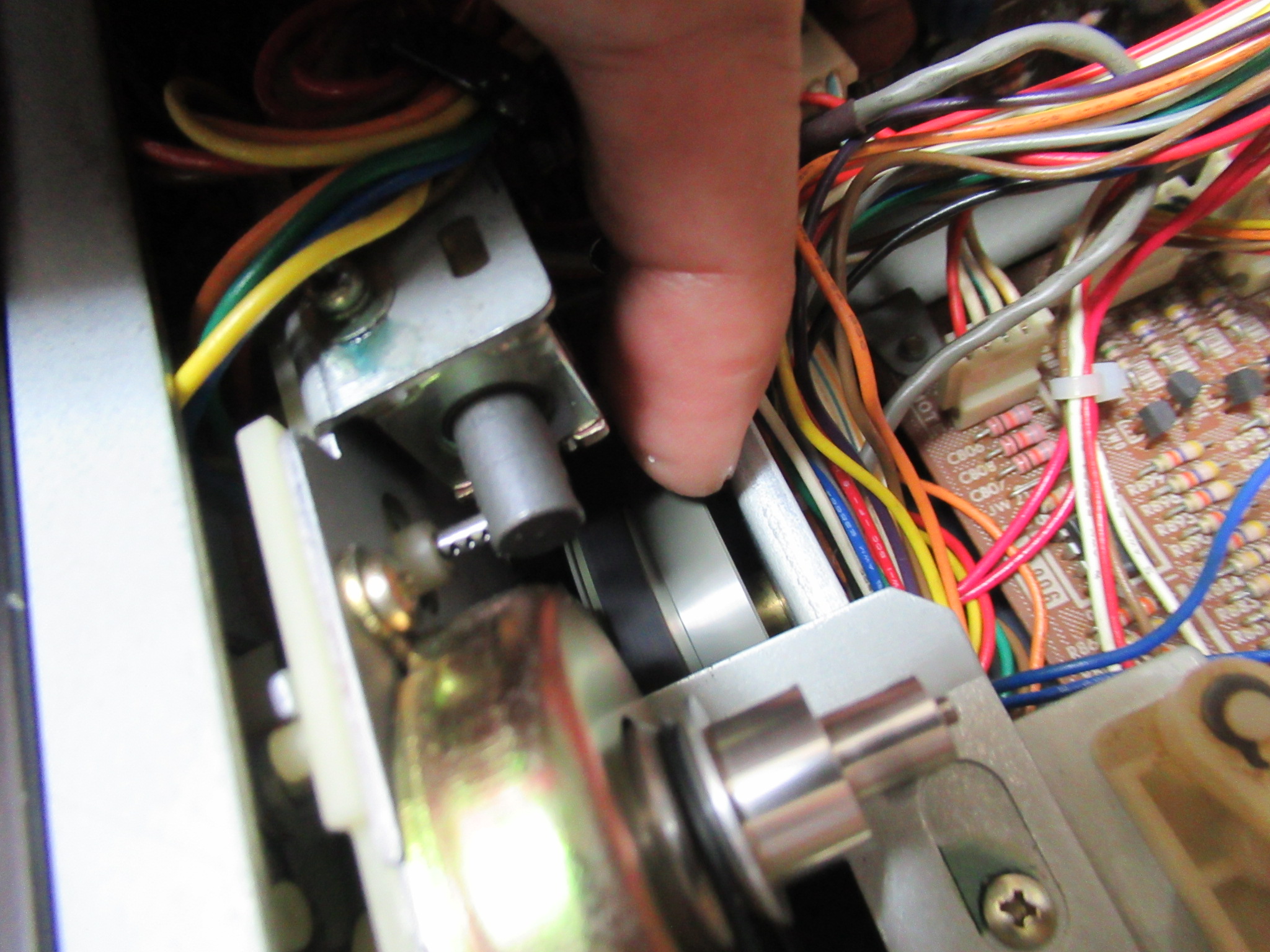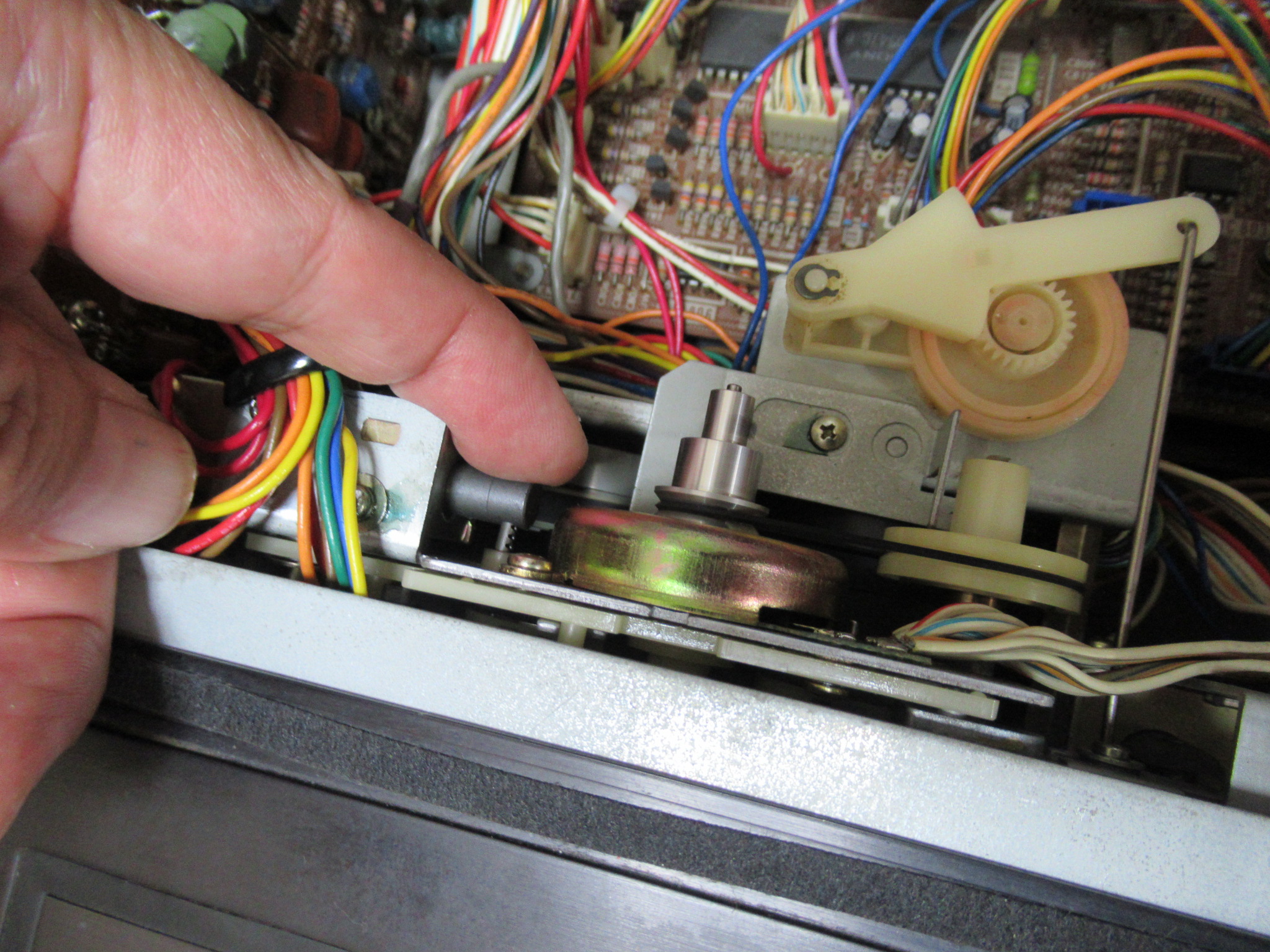 電源が入っていない状態で、フライホイールを指で回してみます。普通は、慣性で少しの間回り続けますが、この機体は、すぐに回転が停止してしまいます。キャプスタンの軸受け部分の抵抗が大きいようです。