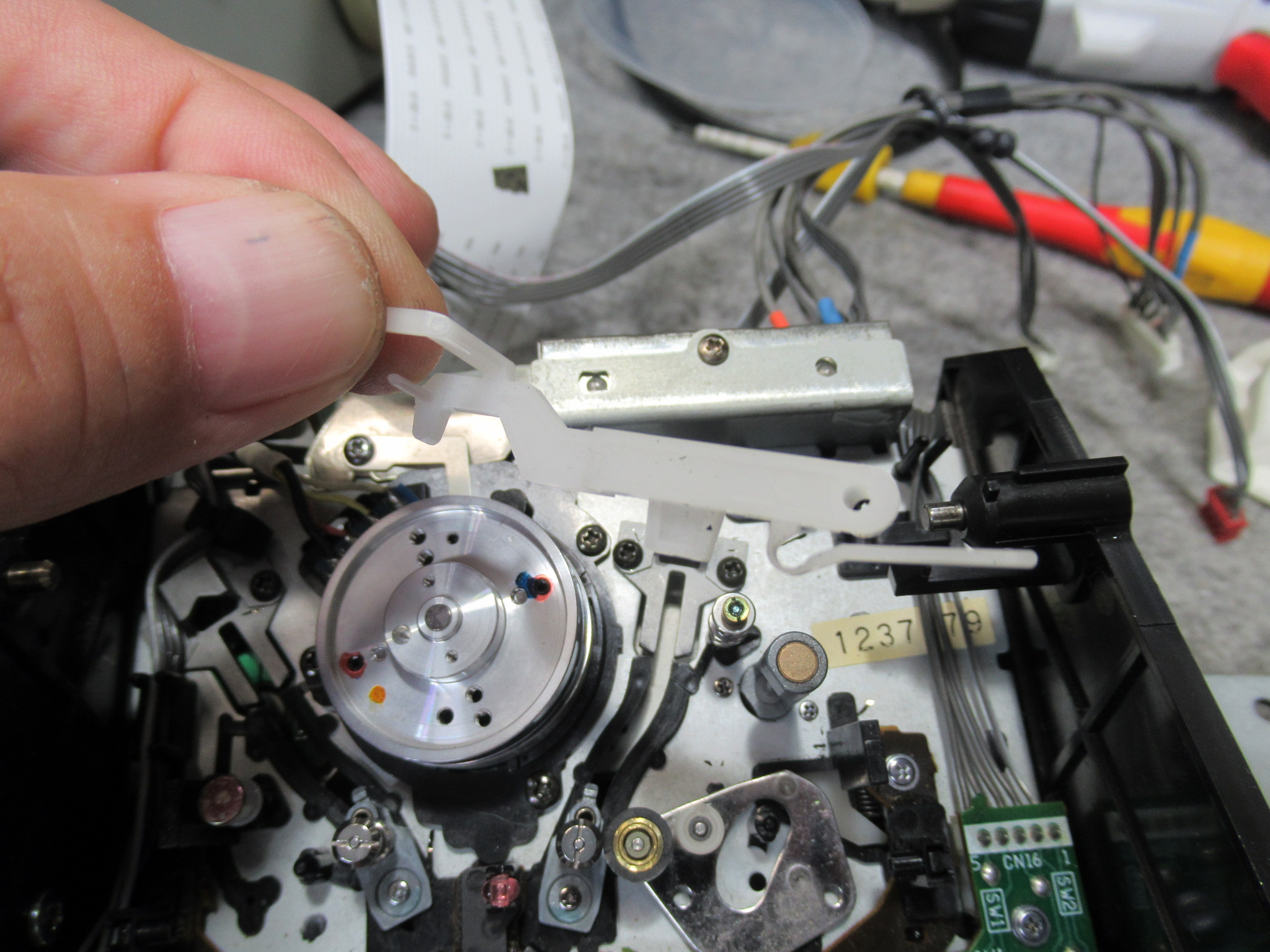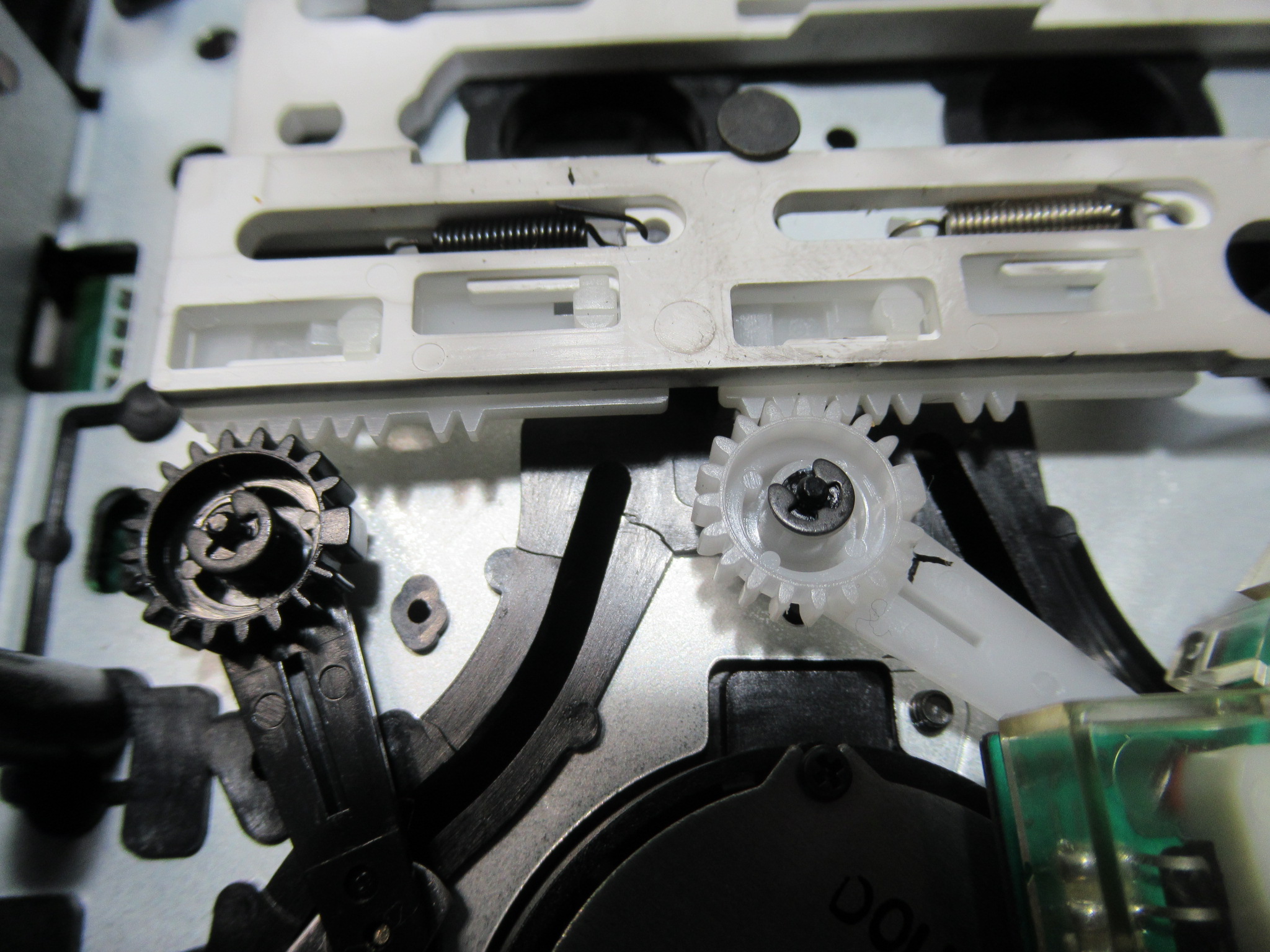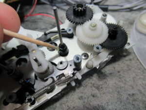 可動式テープガイドを駆動する白黒ギヤを固定している樹脂製留め具には、すでに脱落防止措置として接着剤が処置されていました。念のため、鋼製のEリングと置換します。