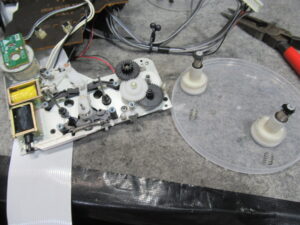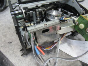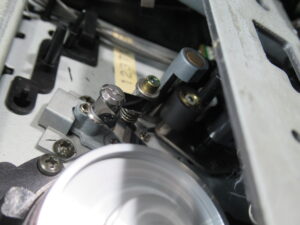 ピンチローラーの辺りを観察すると、テープが途中から脱線することがわかりましたので、バックテンションや巻き取りトルクの調整を行いましたが、一向に改善されません。