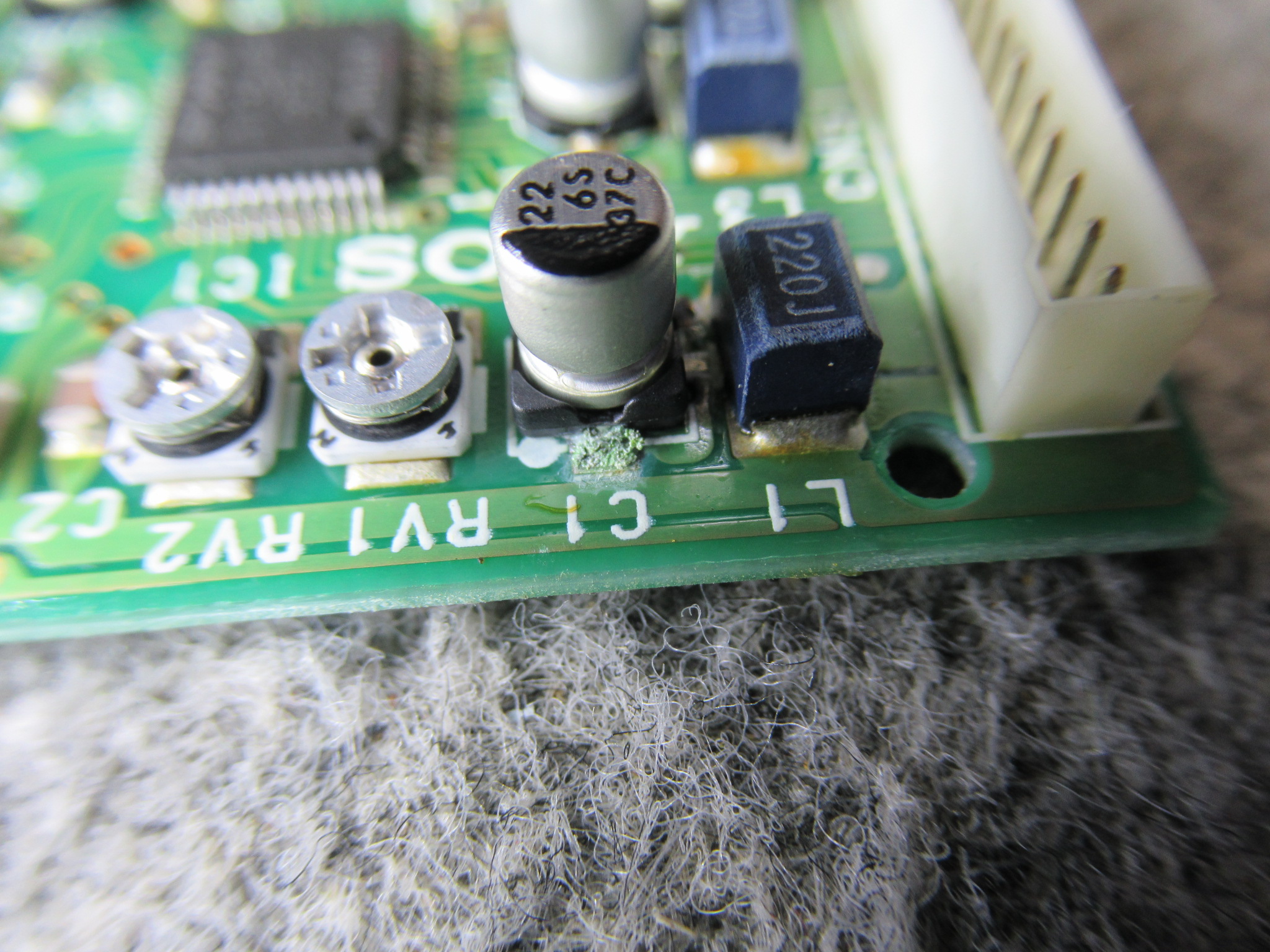 電解コンデンサーの液漏れで端子が錆びていますので、全交換します。