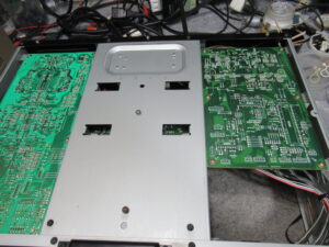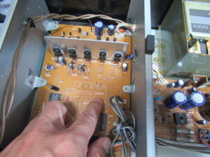 症状から判断すると、接触不良に間違いありません。そこで、コネクタに触れたり、基板を押し付けたりすると、「ガチャン」といって再生が停止しました。