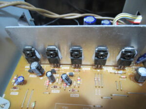 底板を取り外して点検を行うと、5ケのトランジスタほとんどに半田割れが見られましたので再半田します。症状が2パターンだったのは、接触不良個所の違いによるものと考えられます。