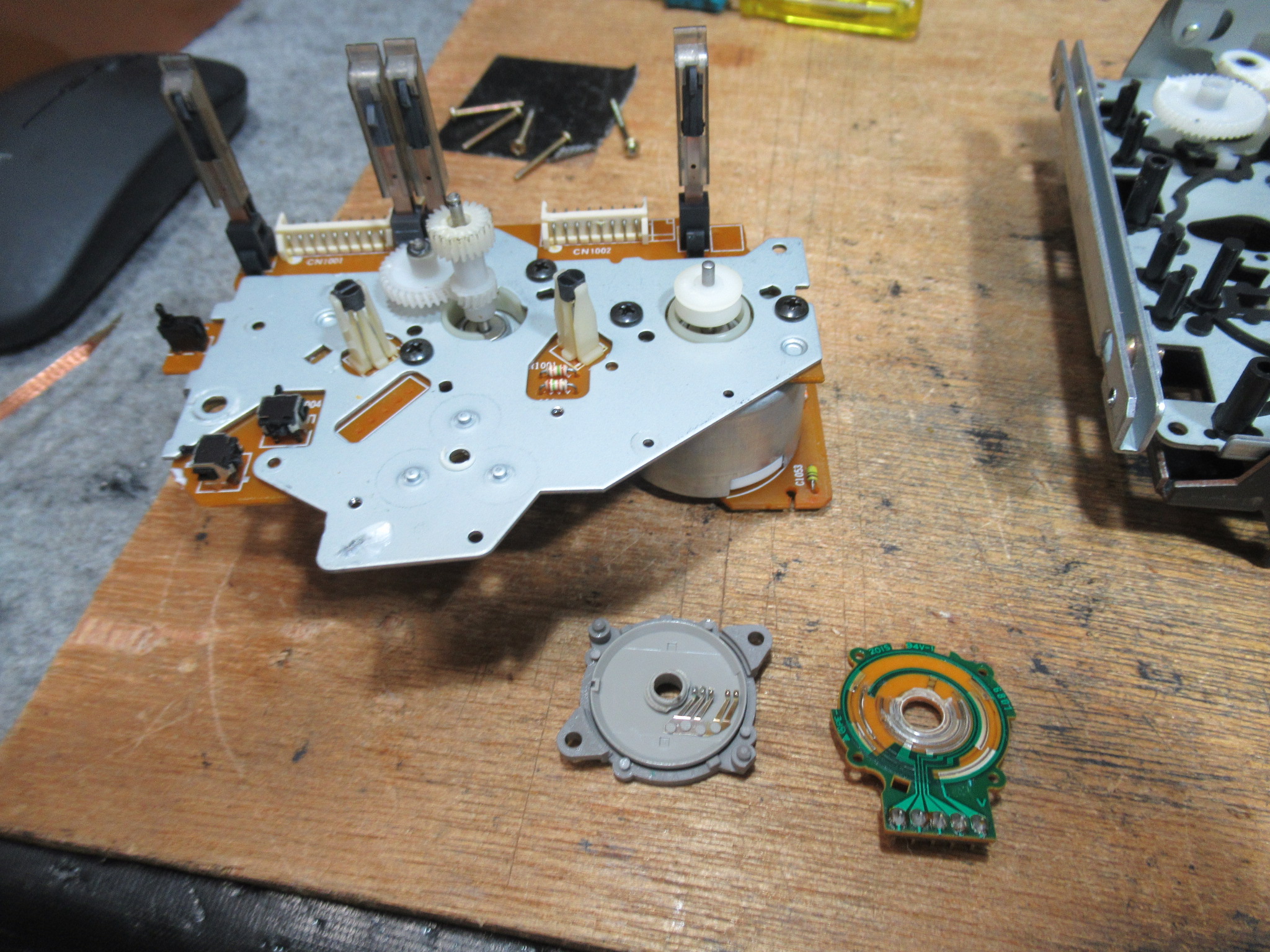 カバーを開けます。再生ヘッドのコネクタが加工補修されています。無理に引き抜いて破損したのでしょうか?