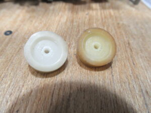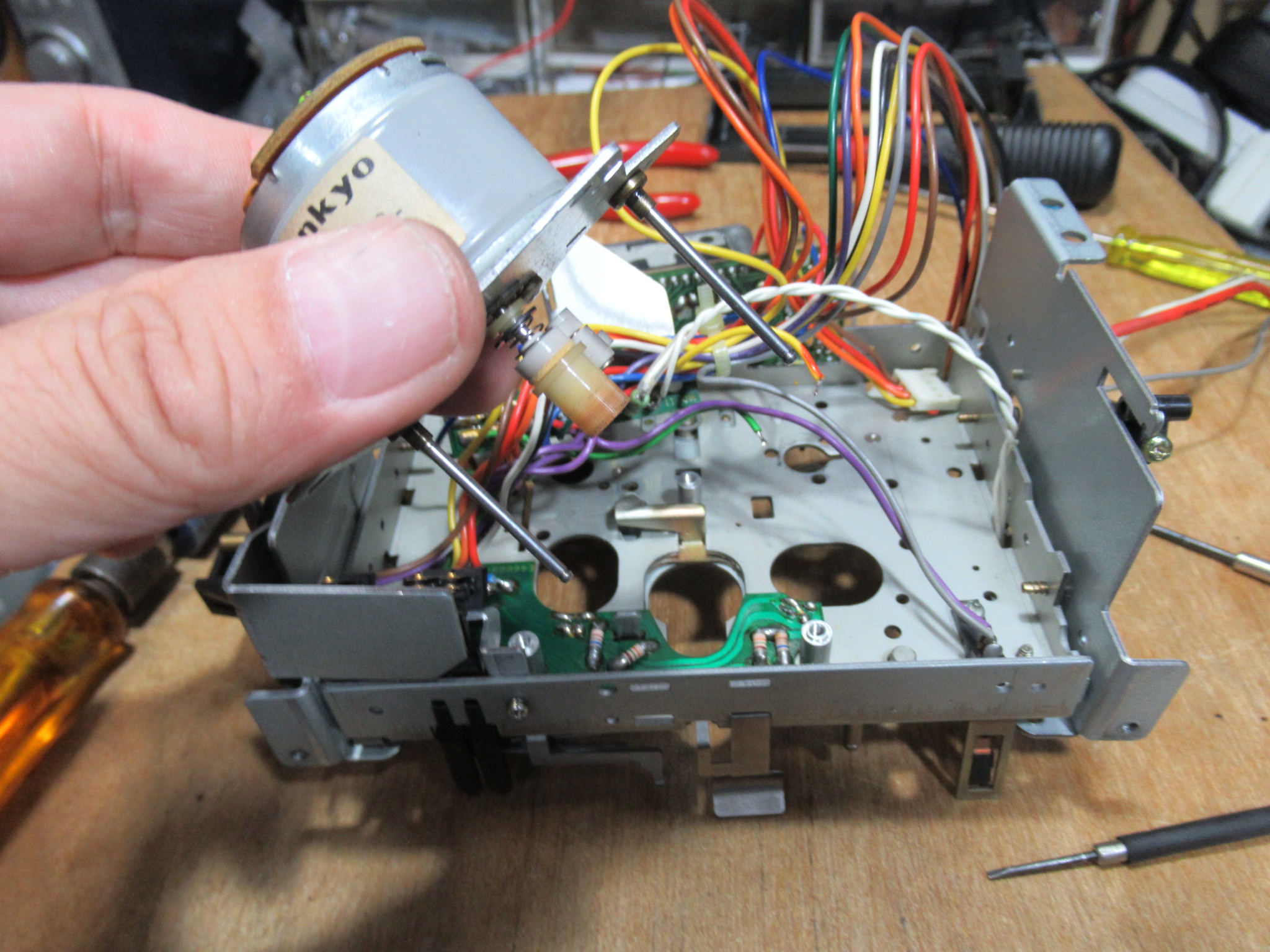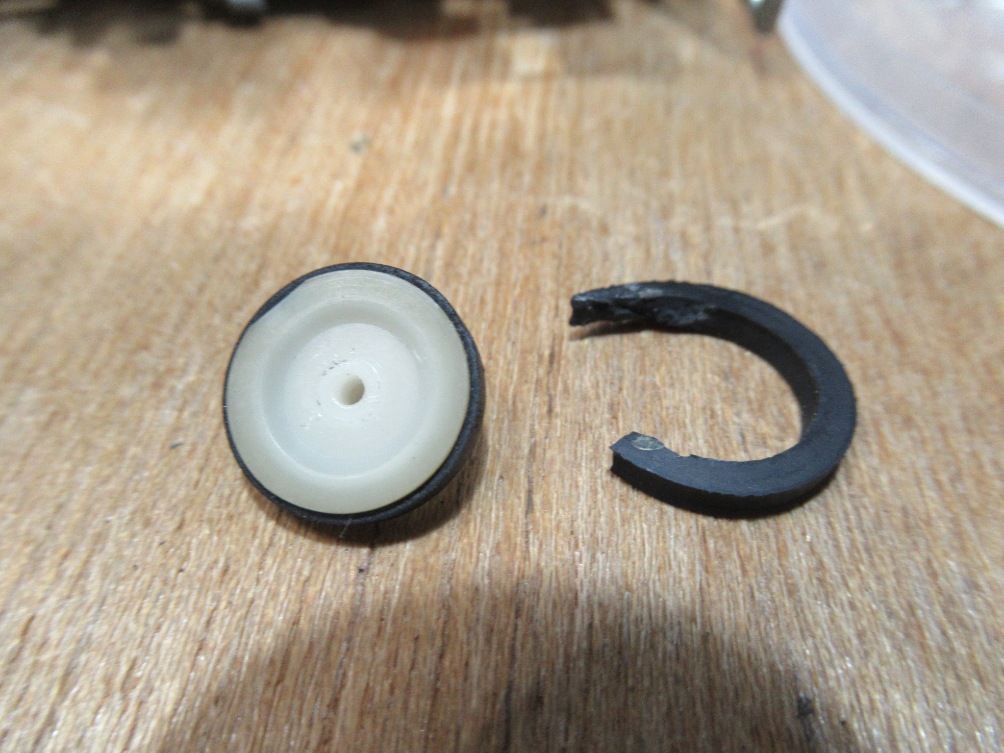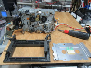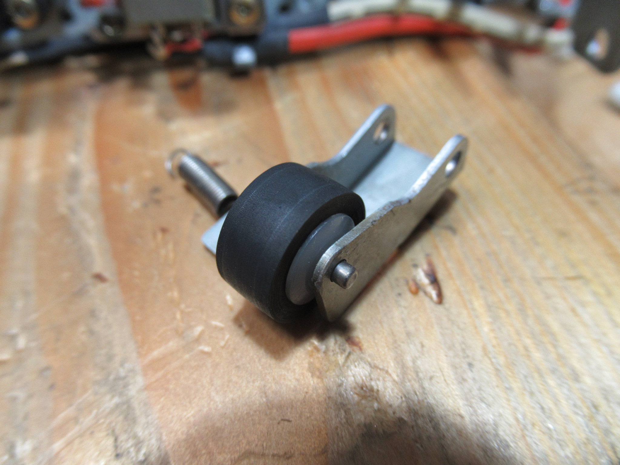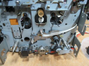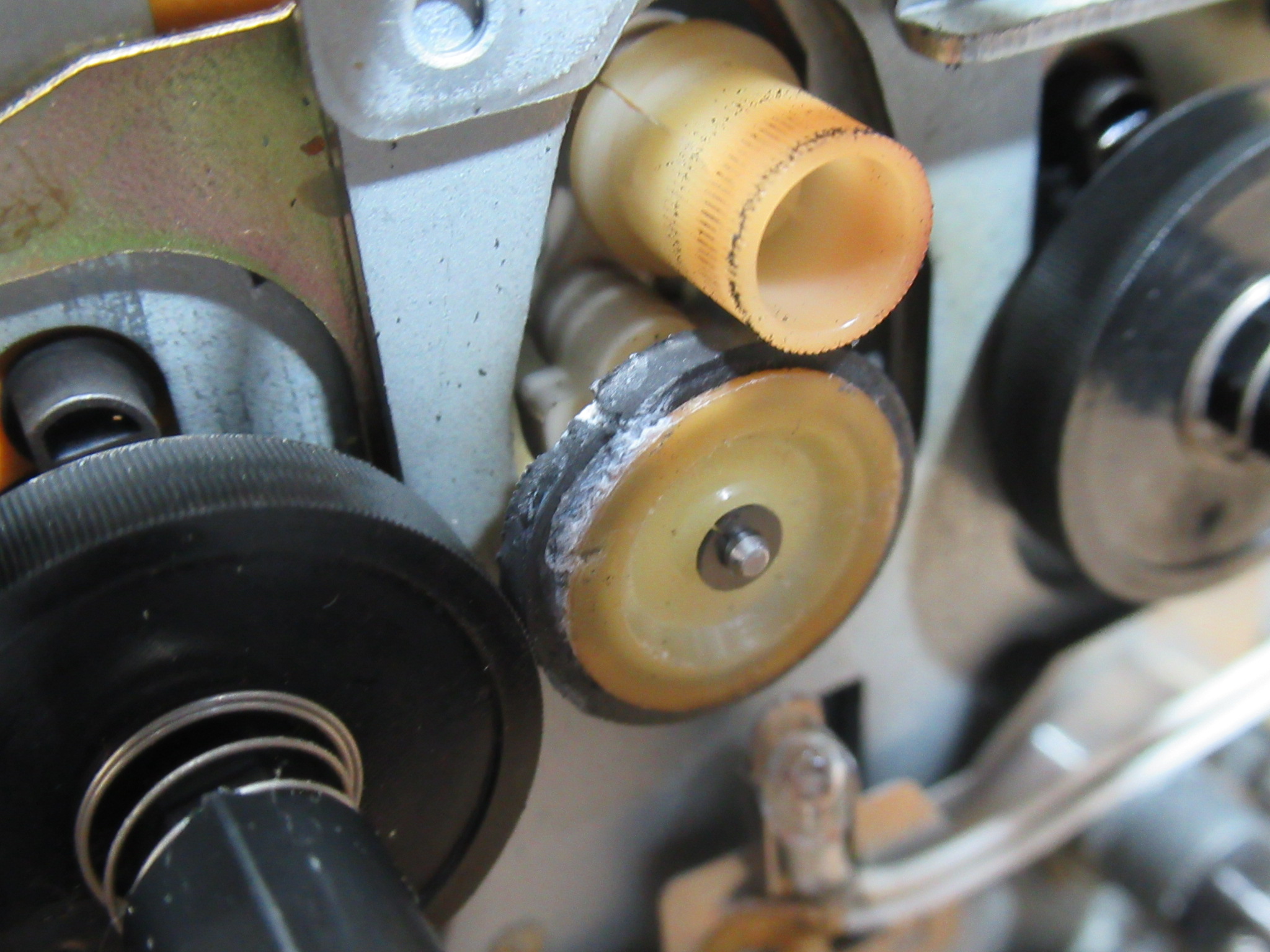 接着剤が完全に除去できないため、手持ちのアイドラーと交換し、ゴムリングも交換します。どうやら、適正なサイズのゴムリングが入手できず、少し大き目のものを切り詰めて接着固定されていたようです。これが異音の原因と思われます。