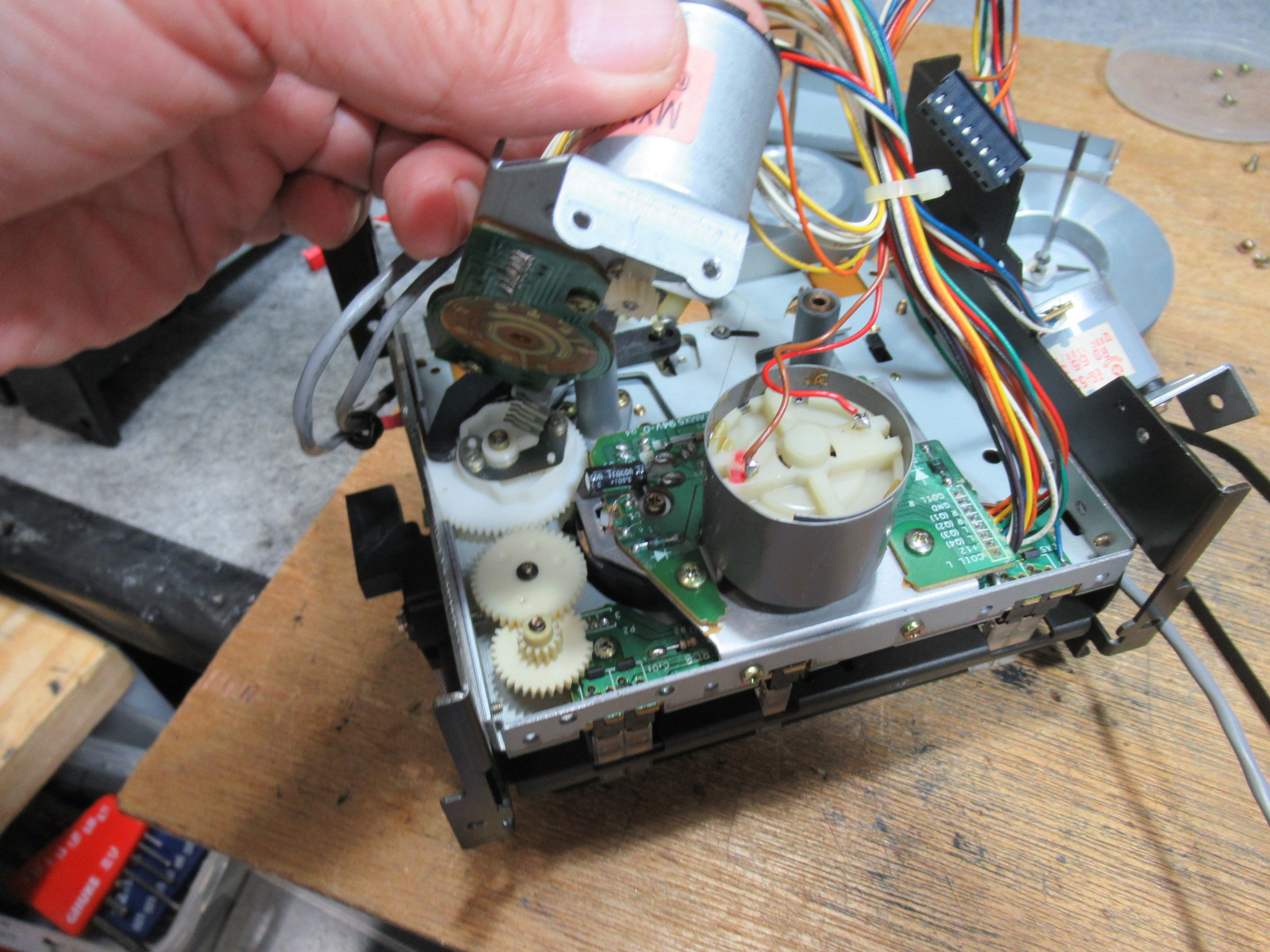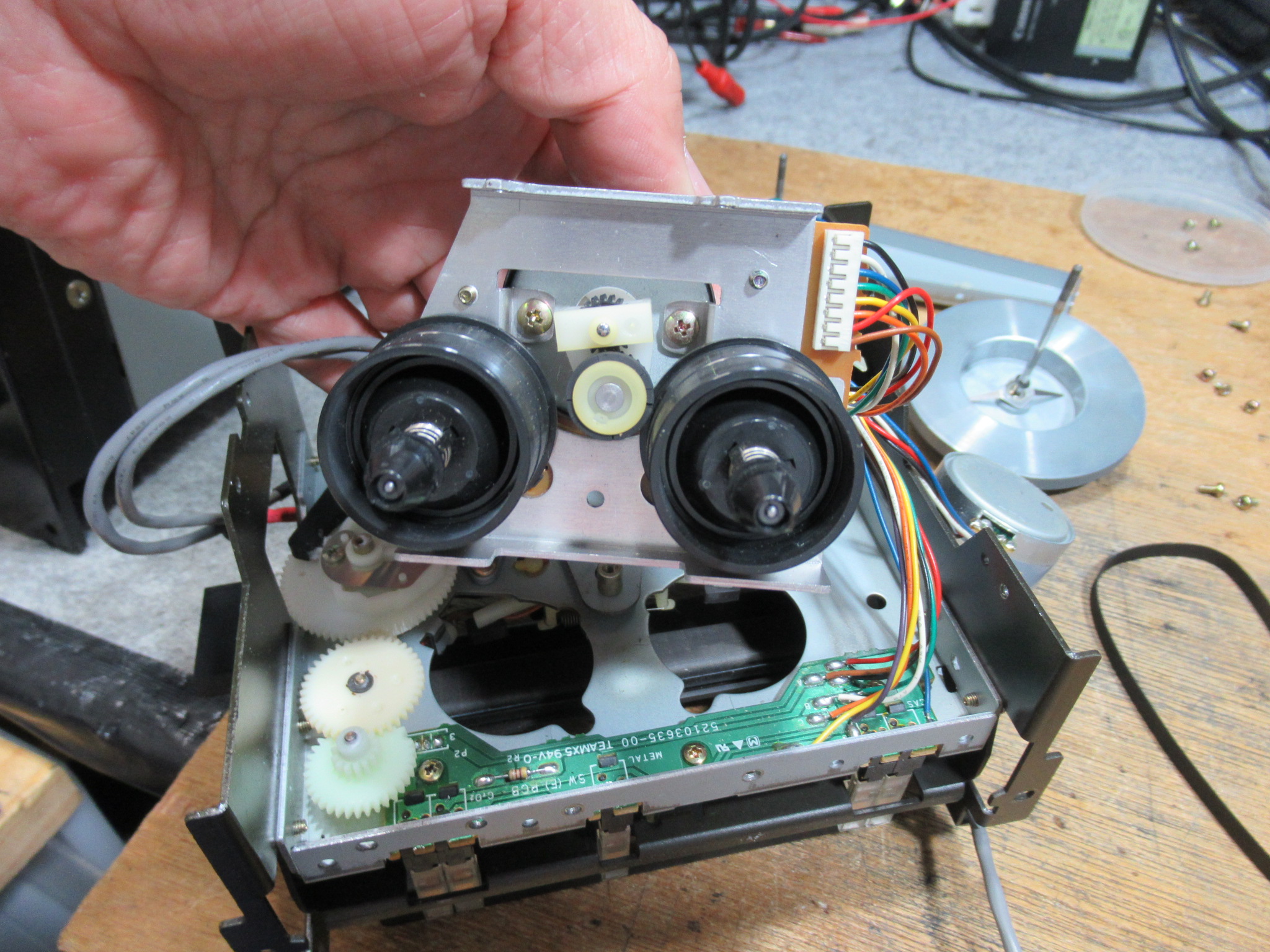 背面のプレート、キャプスタンモーター、フライホイールを取り外します。