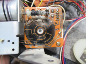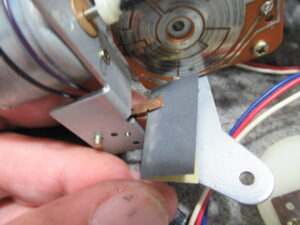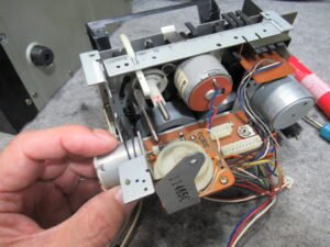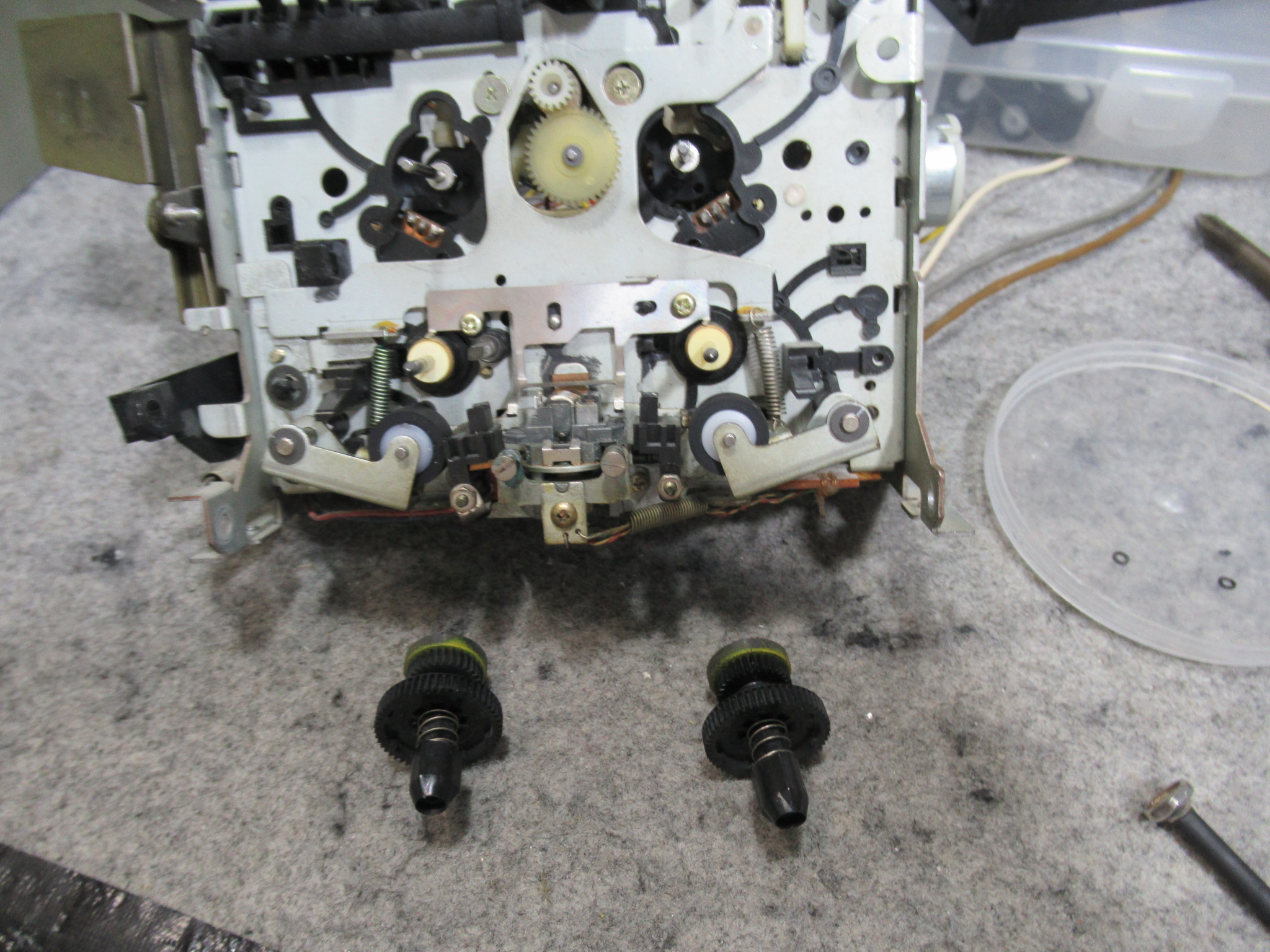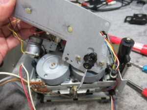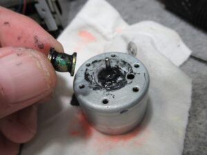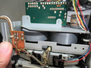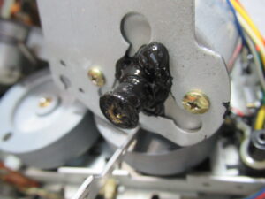 キャプスタンモータープレートを取り外します。加水分解で溶けたベルトがモータープーリーに付着しています。