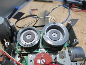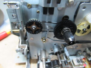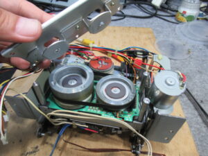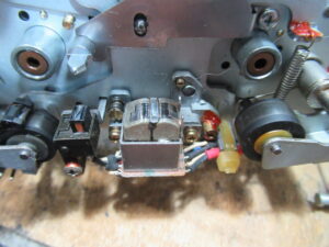 テープが切れてはみ出しています。巻き付いている場所は、ピンチローラーまたはキャプスタンのいずれかになりますが、今回は、どうやらキャプスタンに巻き付いているようです。原因として考えられるのは、キャプスタン・ピンチローラーまたはテープに付着した汚れです。