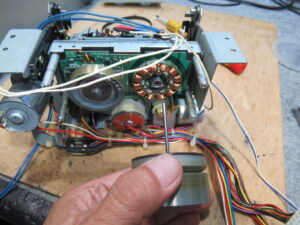 背面のモータープレートを取り外し、テープが巻き付いている側のフライホイールを回しながら引き抜きます。