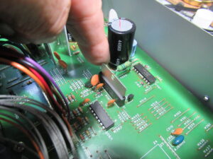参考までに、指差ししているのは、モータードライブIC(BA6219)です。以前、DIY修理されている方から「放熱板が触れないほど発熱する。」と相談を受けましたが、心配は要りません。