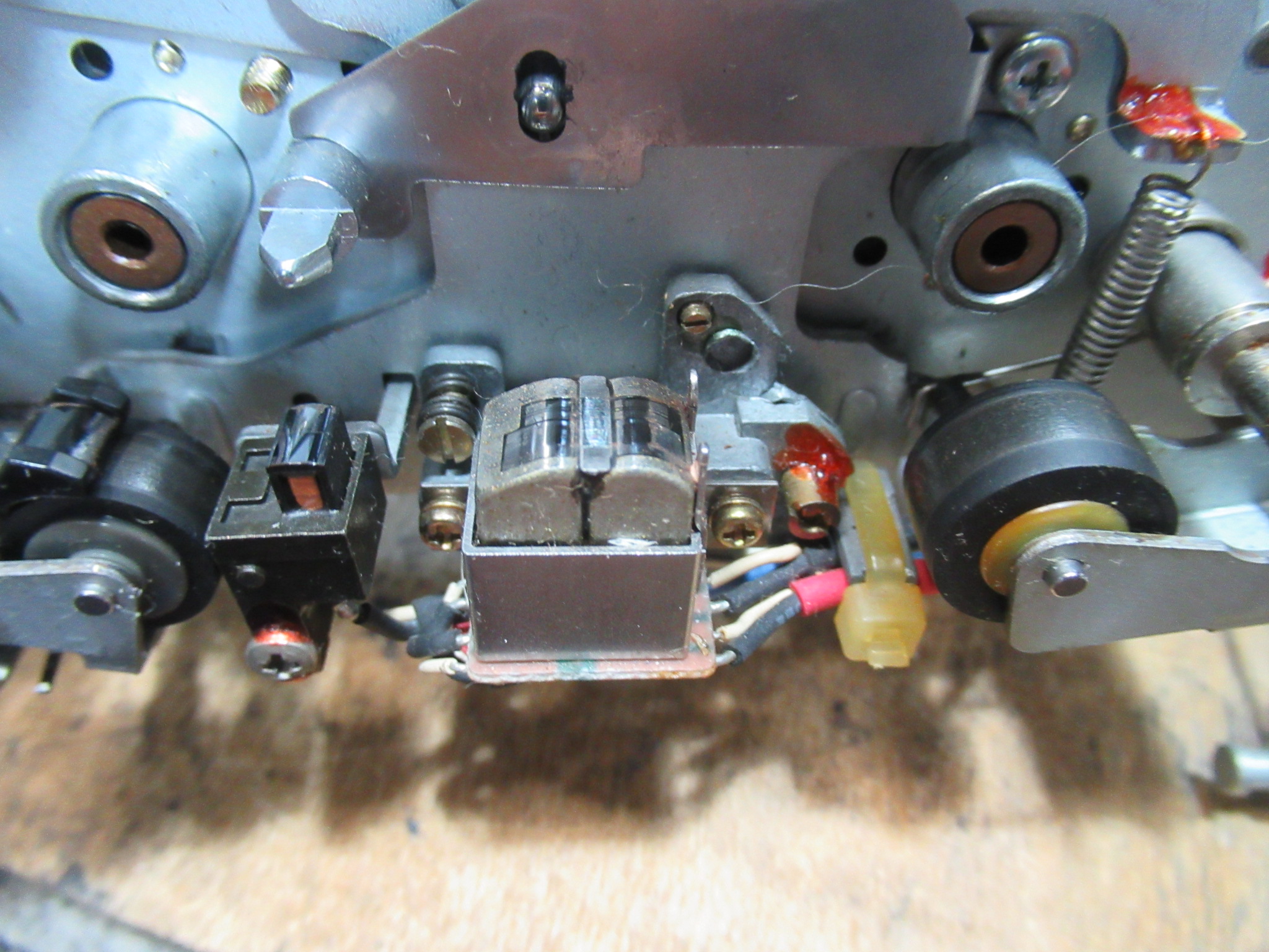 テープが切れてはみ出しています。巻き付いている場所は、ピンチローラーまたはキャプスタンのいずれかになりますが、今回は、どうやらキャプスタンに巻き付いているようです。原因として考えられるのは、キャプスタン・ピンチローラーまたはテープに付着した汚れです。