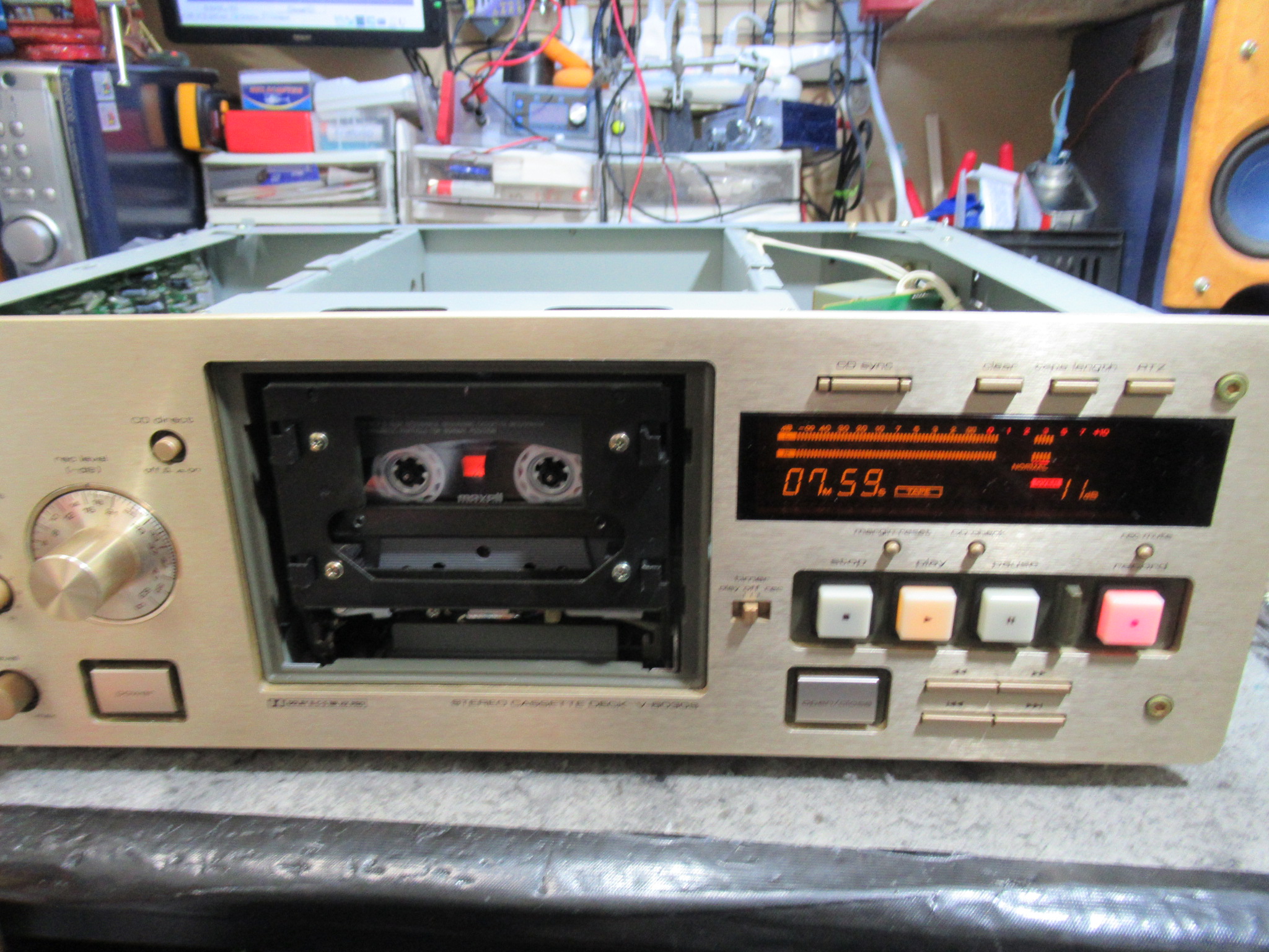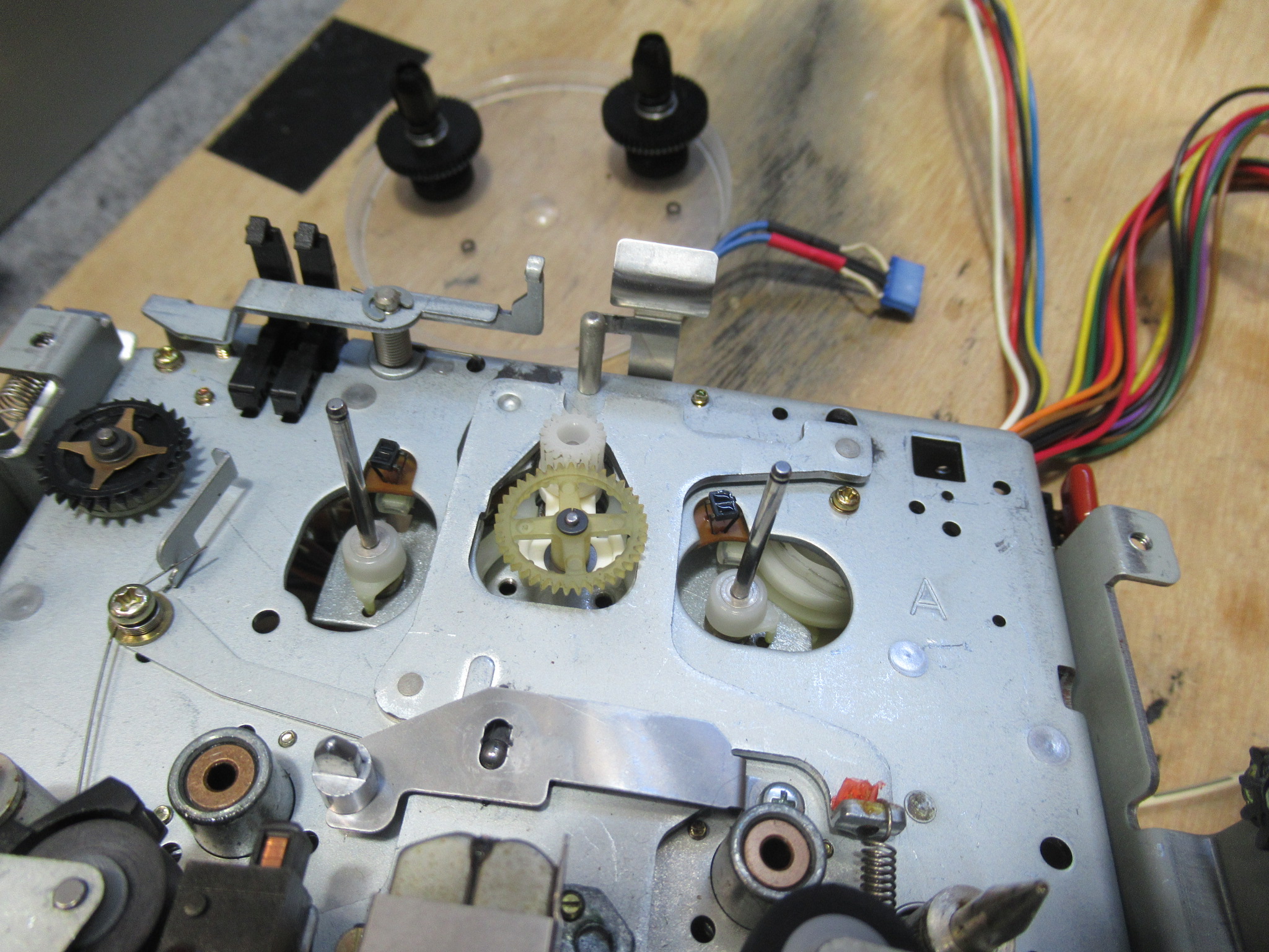 TEAC製3ヘッドデュアルキャプスタンカセットデッキ、V-8030Sですが、再生中にテープを巻き込んでしまったようです。そのため、リッドが開かなくなっています。