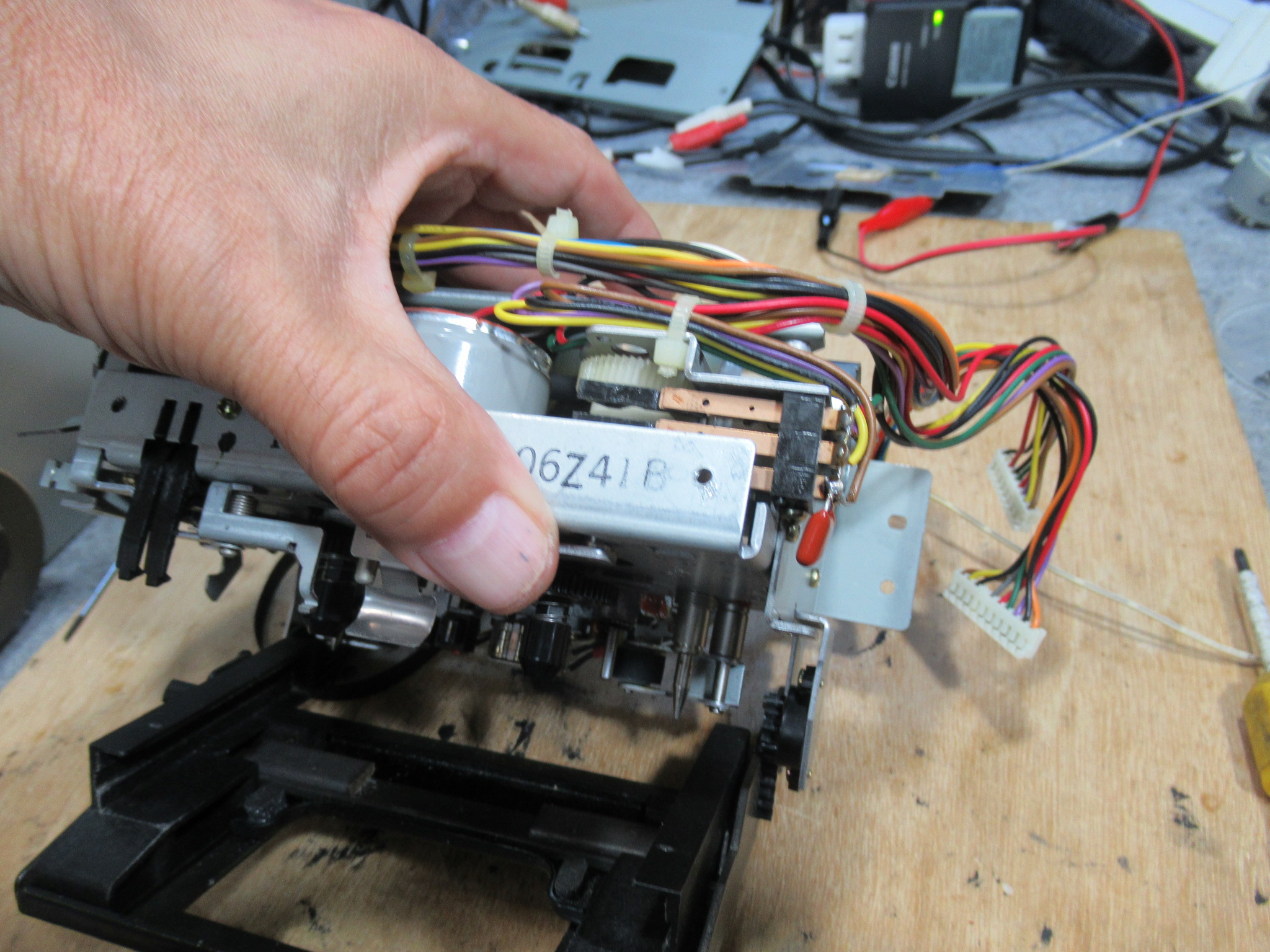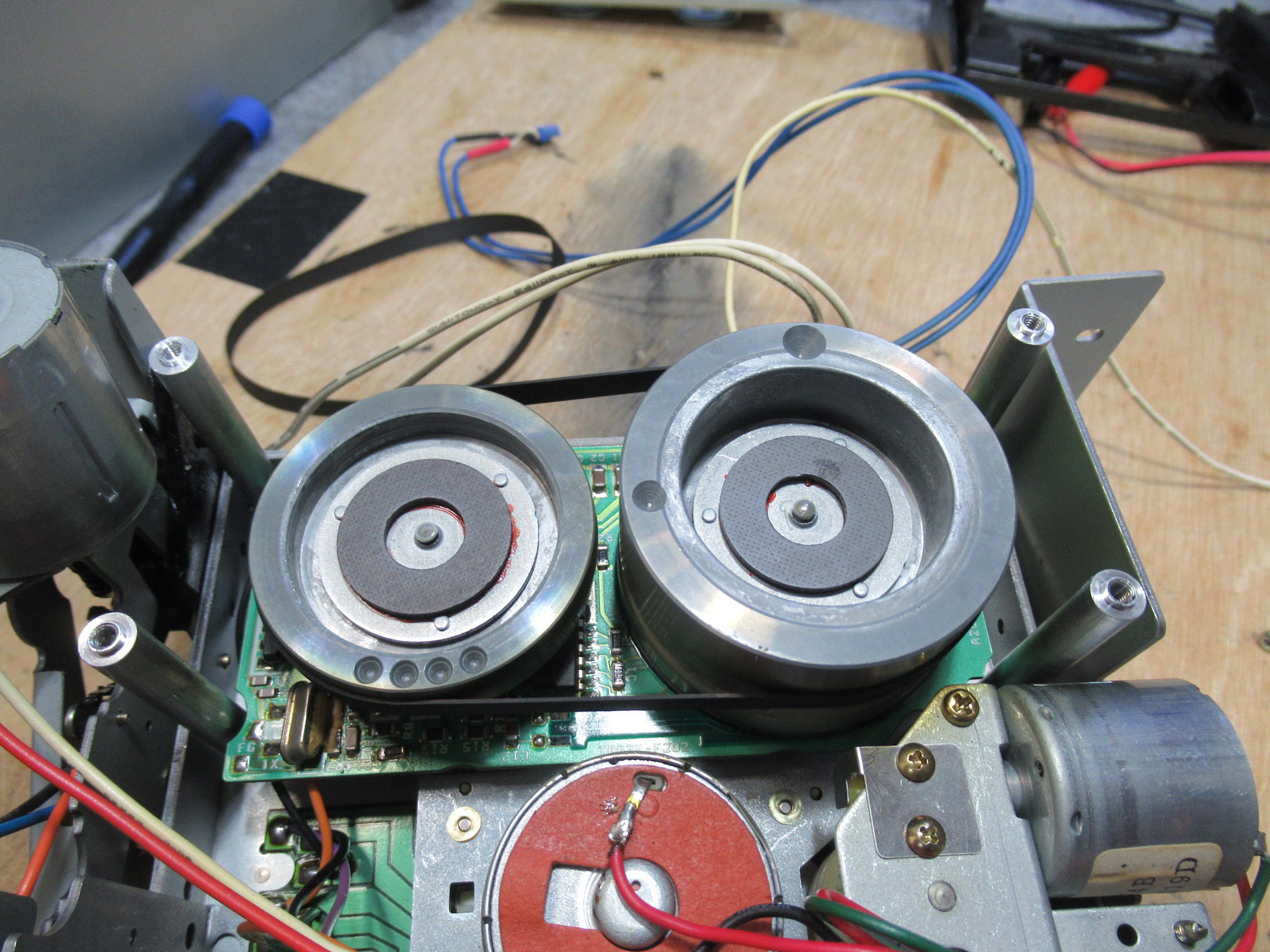 背面のモータープレートを取り外し、テープが巻き付いている側のフライホイールを回しながら引き抜きます。