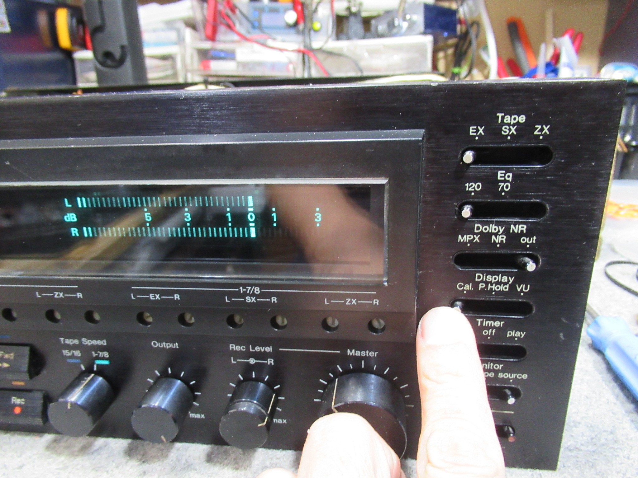 メーターをキャリブレーションに切り替えると、RCHが振り切ります。スイッチの接触不良が原因ですので、接点復活剤を処置します。タイマースイッチやモニター切替スイッチにも接触不良が見られましたので、同様の処置を行い、100%とは言えませんがおおむね改善は見られました。