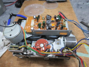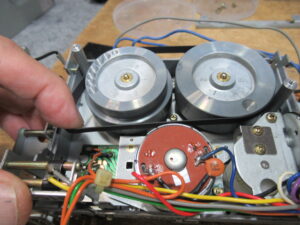 カバーを開けて点検を進めます。キャプスタンモーターは回転していますので、ベルトスリップが起きていることが不具合の原因です。