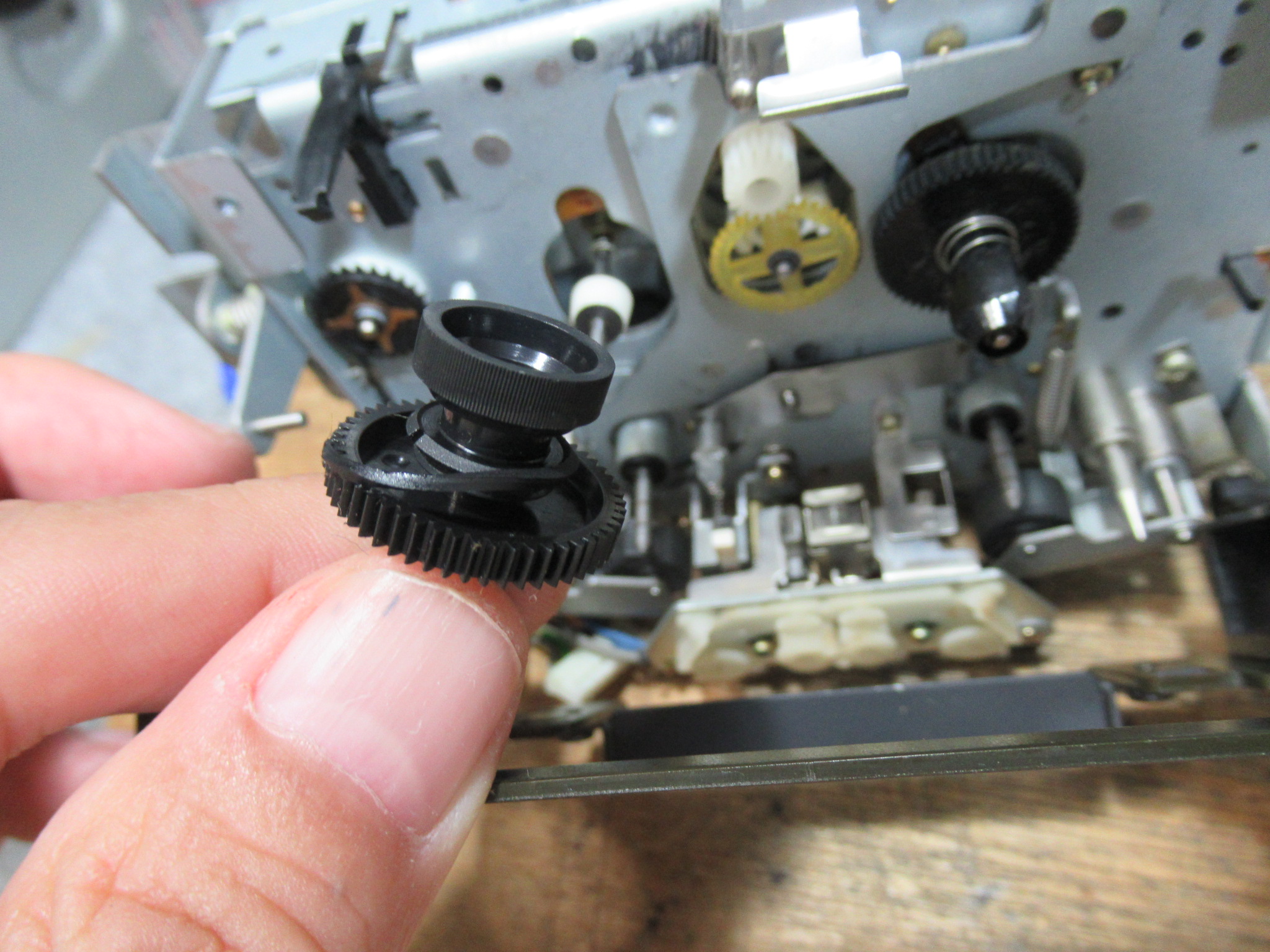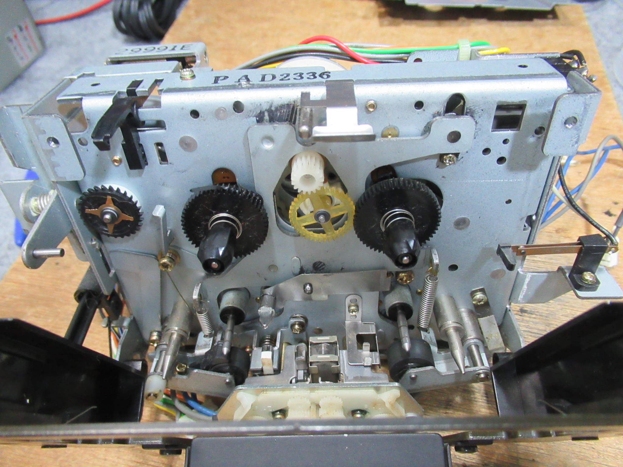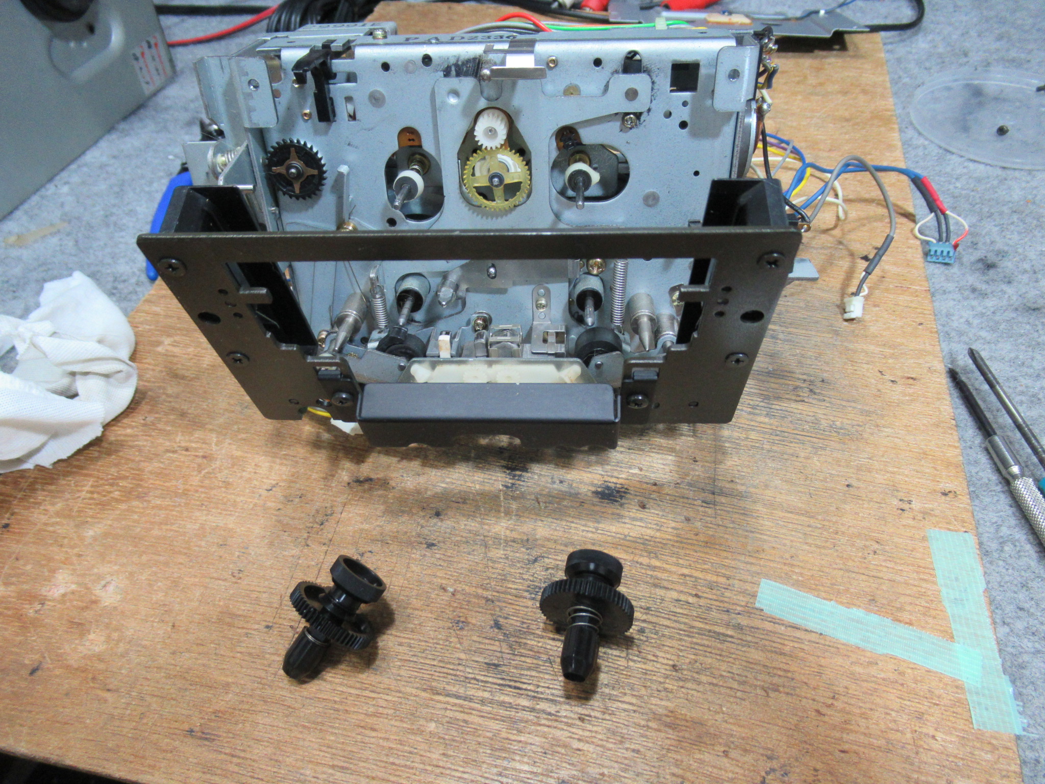 化粧パネルを取り外します。バックテンションベルトが無くなっています。このままでは走行が不安定になり、テープを痛めることがあります。
