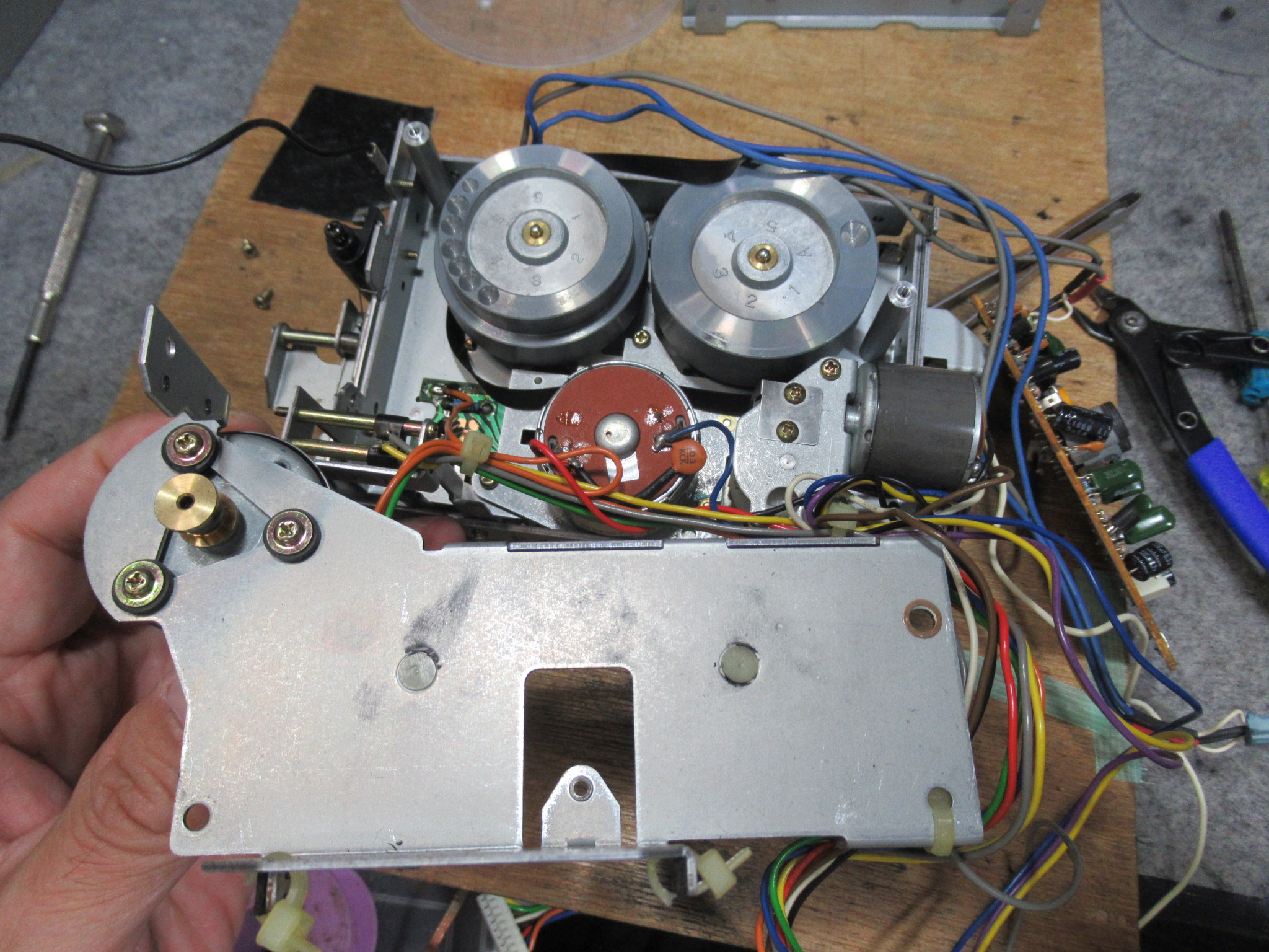 カバーを開けて点検を進めます。キャプスタンモーターは回転していますので、ベルトスリップが起きていることが不具合の原因です。