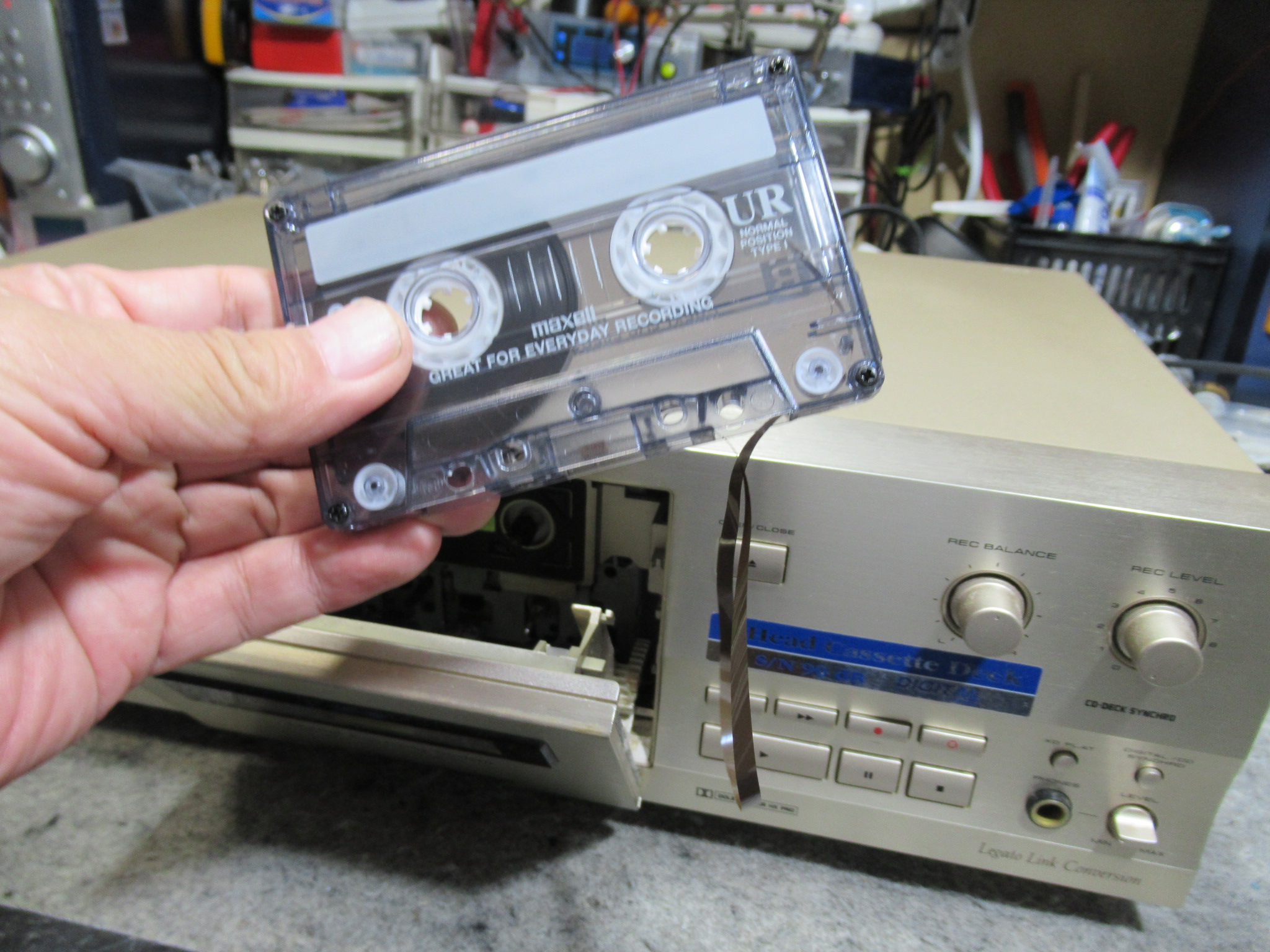 そのため、再生すると、テープが写真のように引き出されてしまいます。
