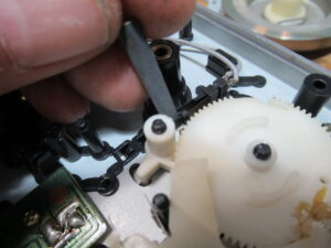 早送り巻き戻し用のアイドラーユニットが現れますので、脱着してゴムリングを交換します。