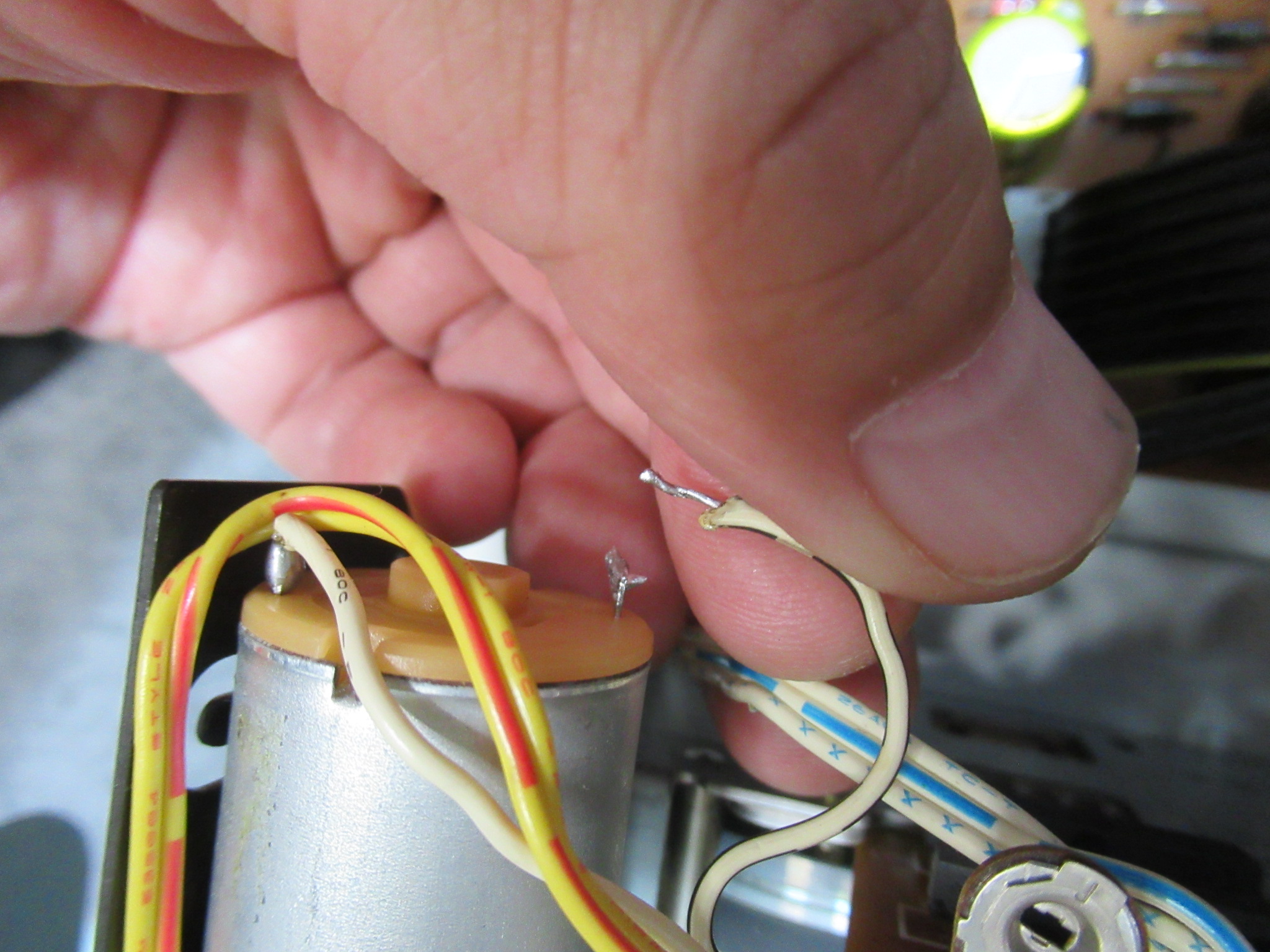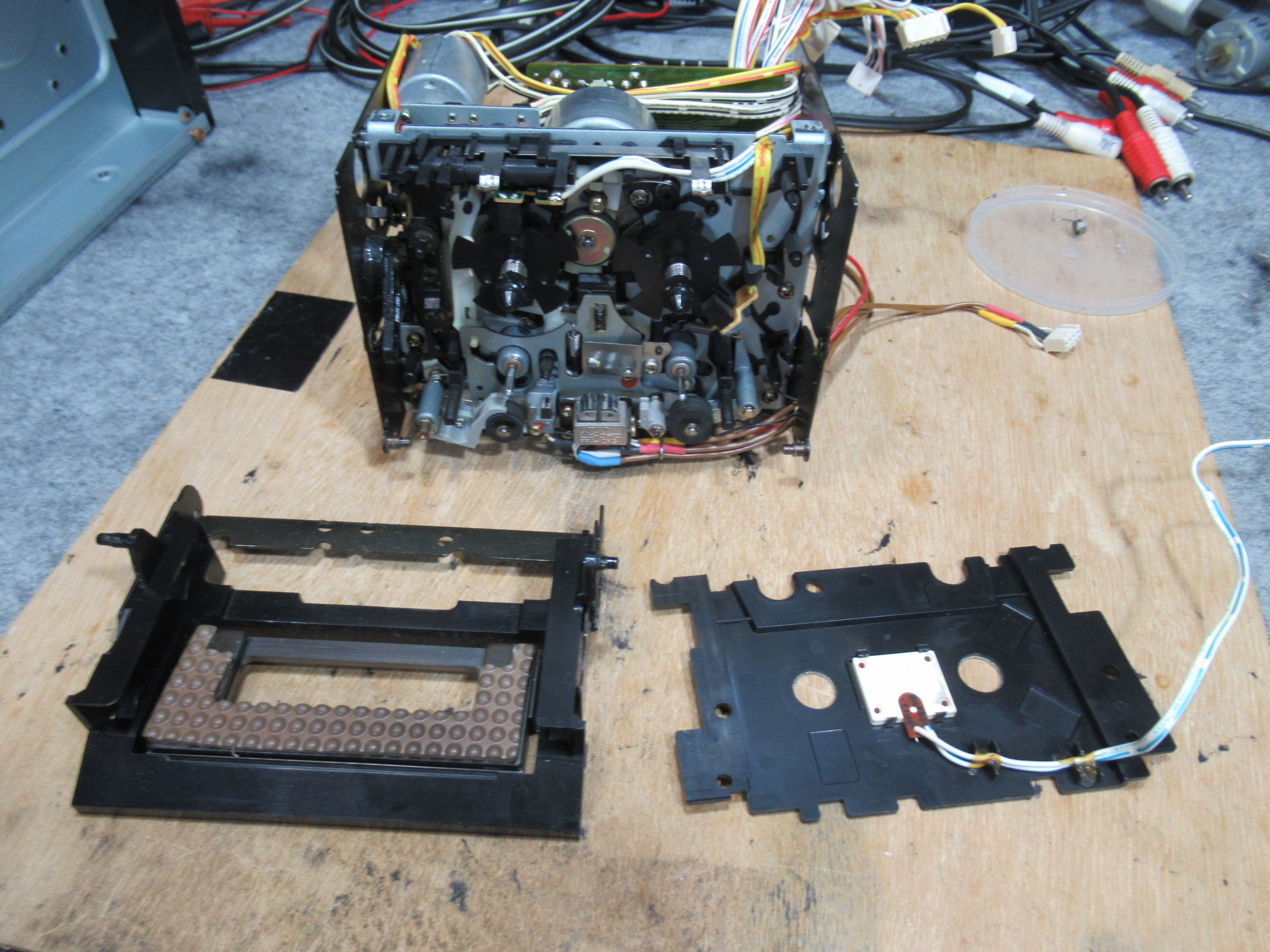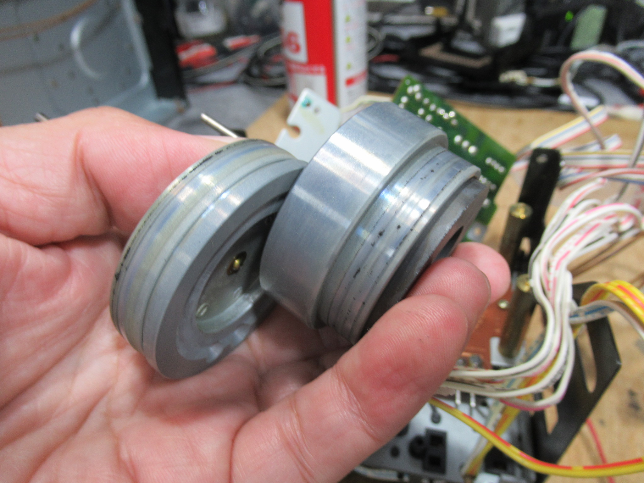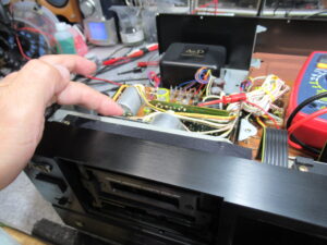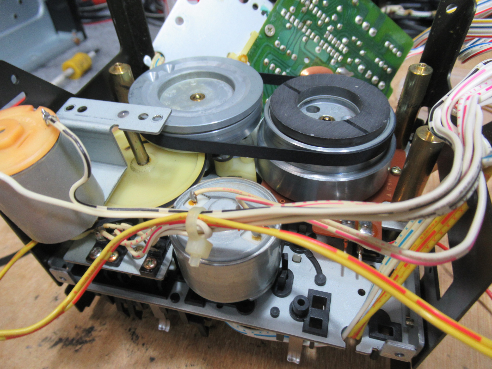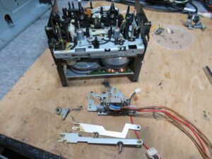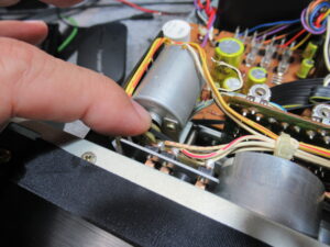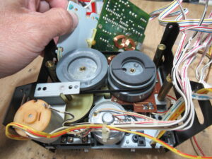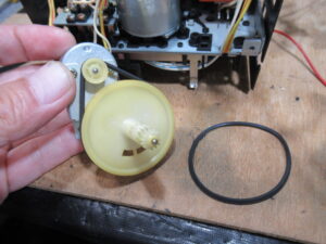 電源を切った状態で、カムモーターの配線を切り離し、カムモーターのプーリーを反時計回り一杯回します。トレイが開いてこれ以上回せないとことまで回します。
