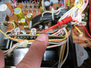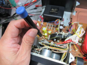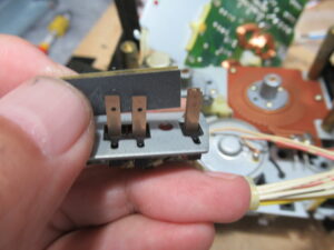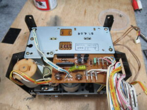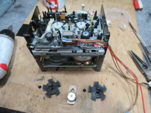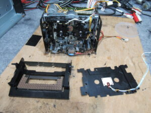 カバーを開けます。指差していいるのが、カムモーターの調整用半固定抵抗です。まずは、サービスマニュアルに従い、点検調整を行います。