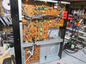 カバーを開けて、底板を取り外します。結束バンドの状態から、過去に基板を脱着しての修理が行われたことが伺えます。このとき少し嫌な予感がしましたが、後ほどそれが的中しました。