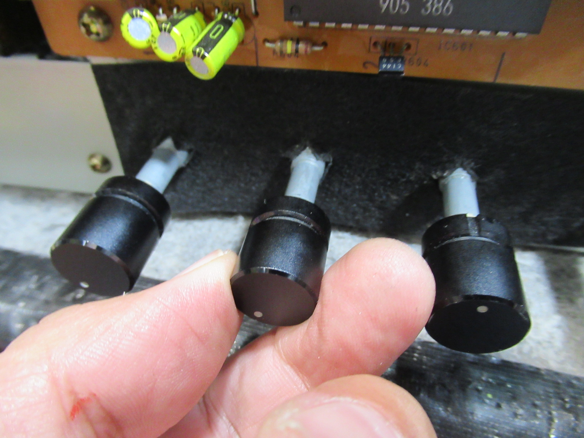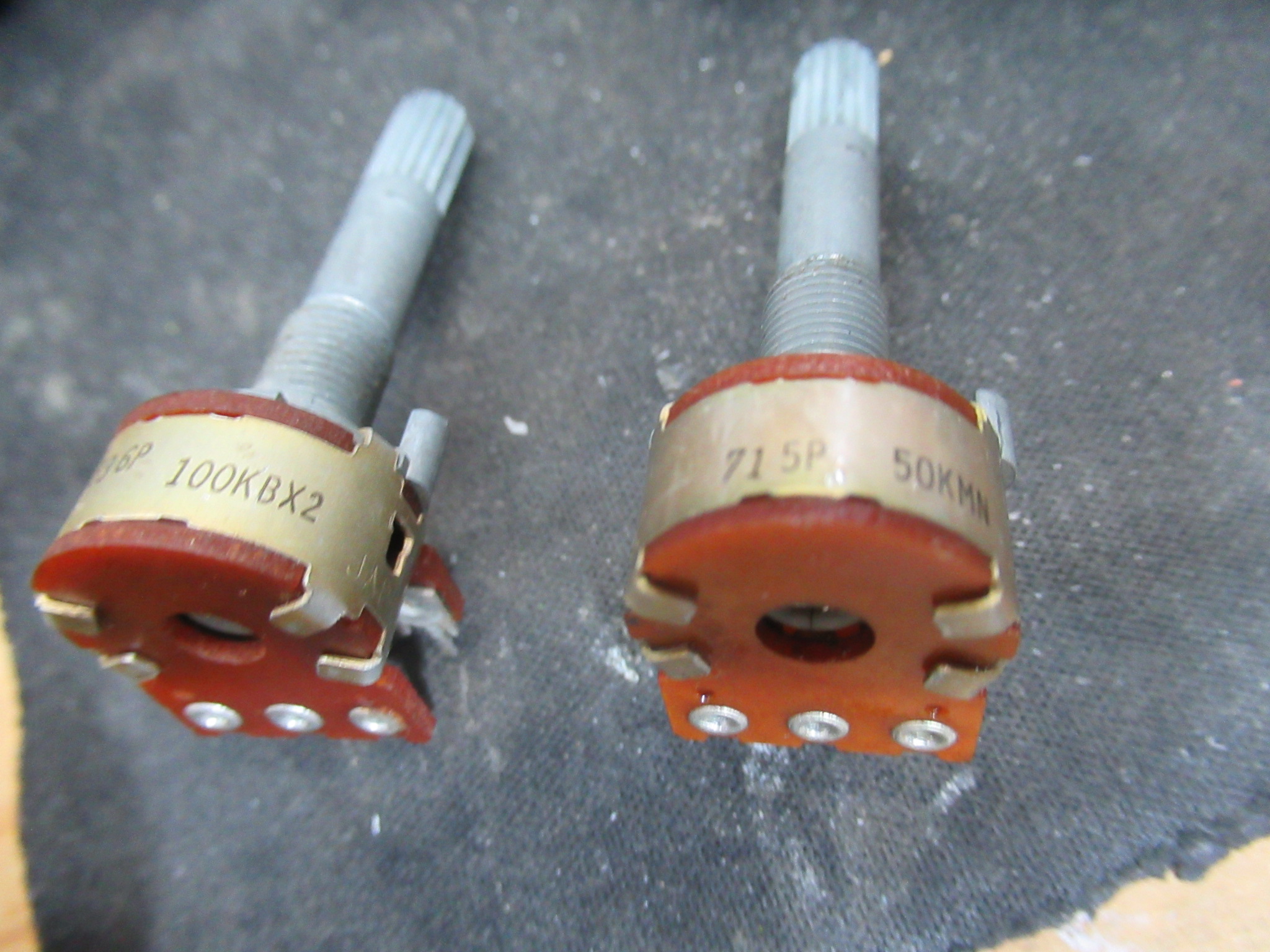 外観は一緒ですが、まったく異なるパーツが取り付けられていました。これは、おそらくGX-Z7000などのバランスVOLと思われますが、そもそもの抵抗値も違えば、回したときの左右の抵抗値の変化量も異なります。以前修理された方がそれを知らずに交換されたようですが、録音ができなかったためにミスに気がつかなかったようです。