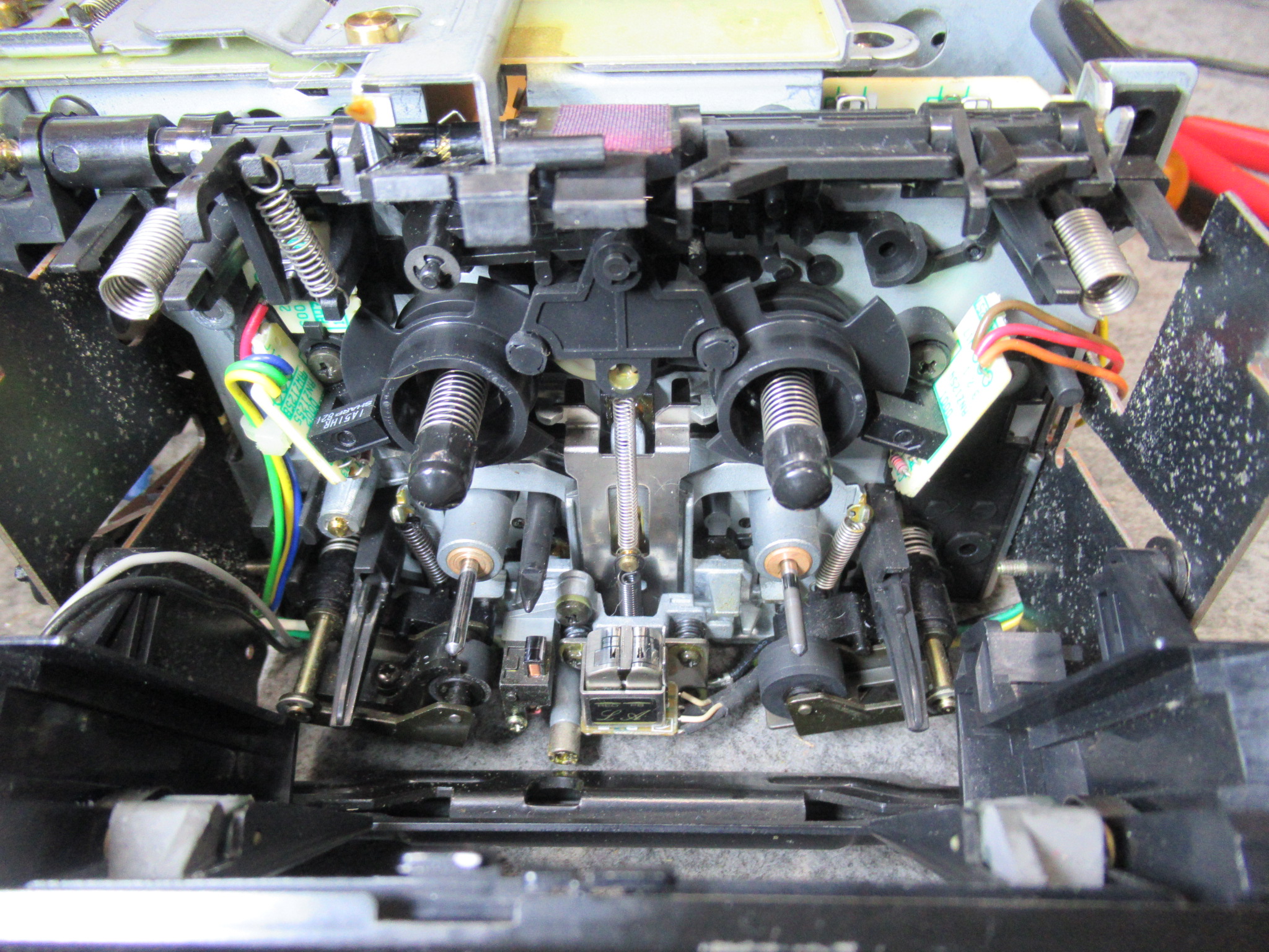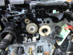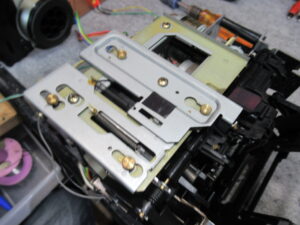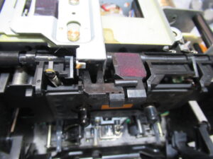 カバーを開けました。驚いたのは、キャプスタンベルトがよじれていたことです。前回修理された方のミスということになりますが、動作には影響は無かったようです。
