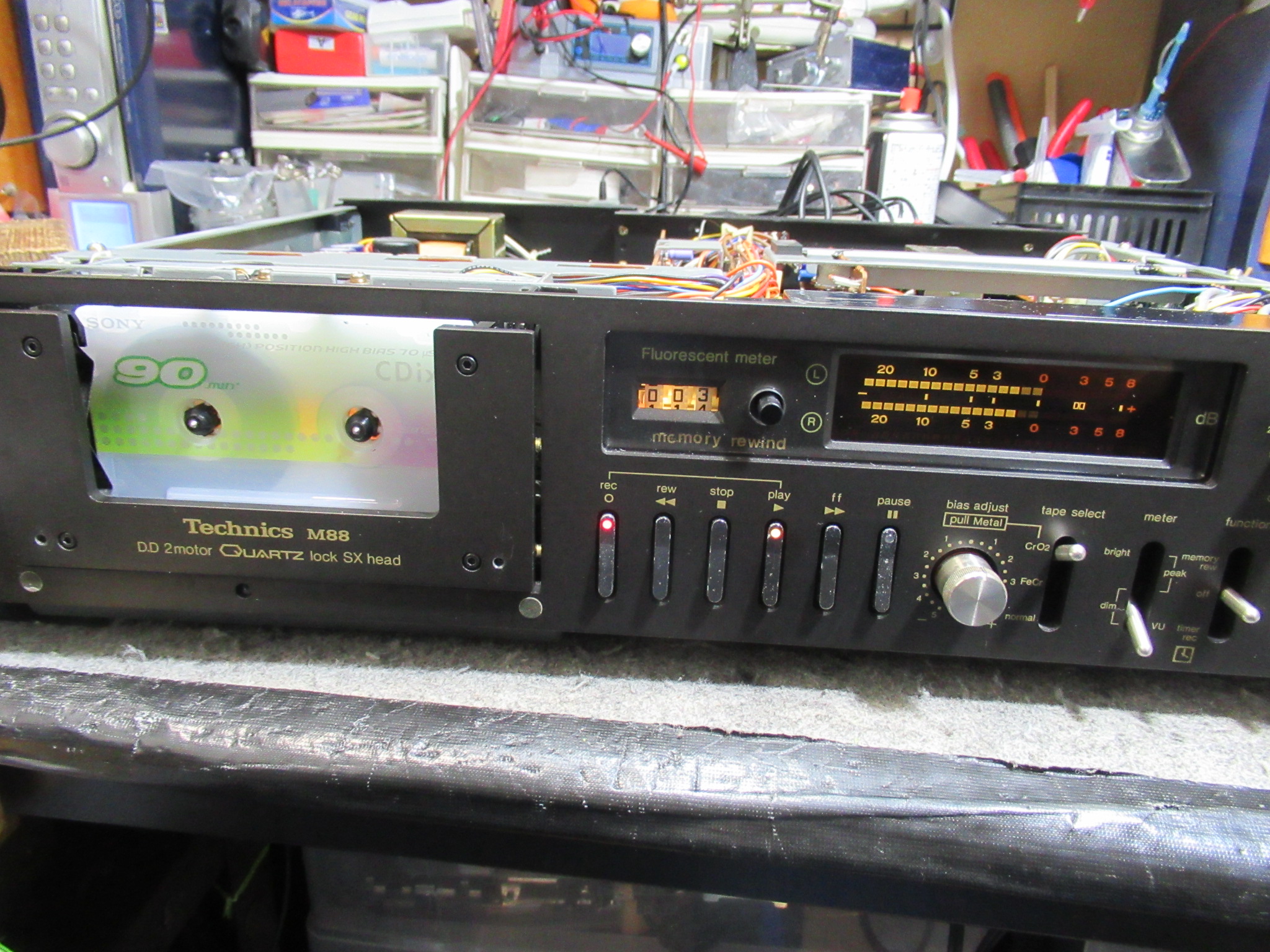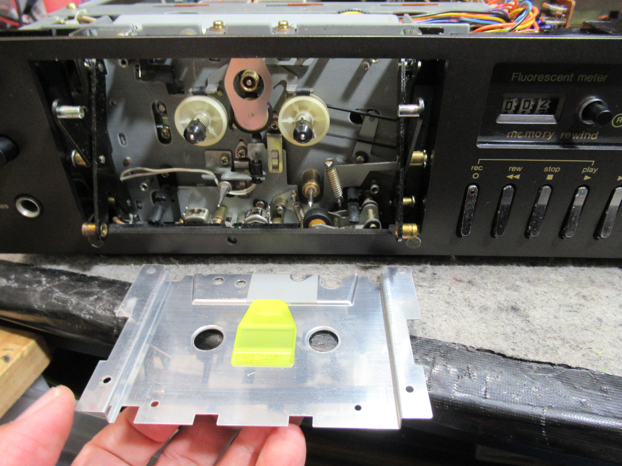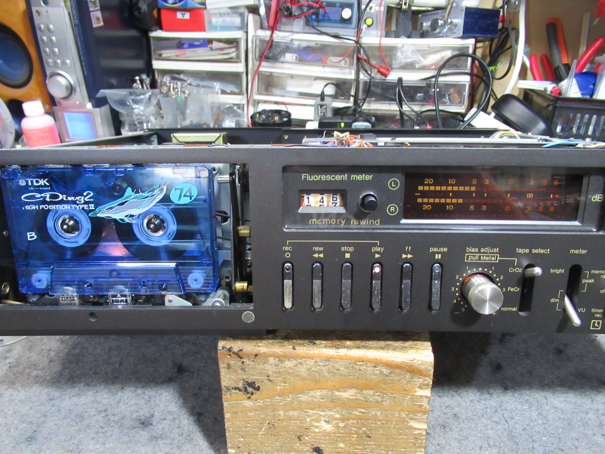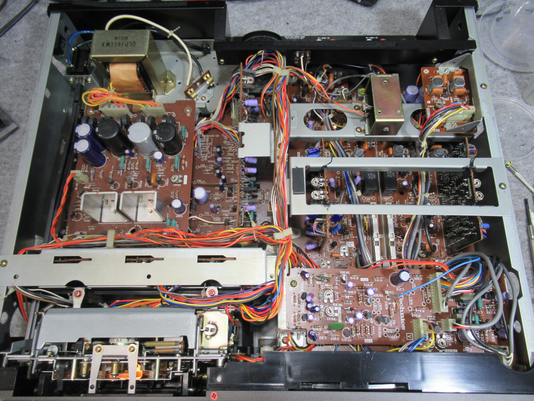 カバーを開けてメカを覗き込みます。アイドラーがスリップしていることが確認できましたが、メカを降ろすのは見るからに厄介です。