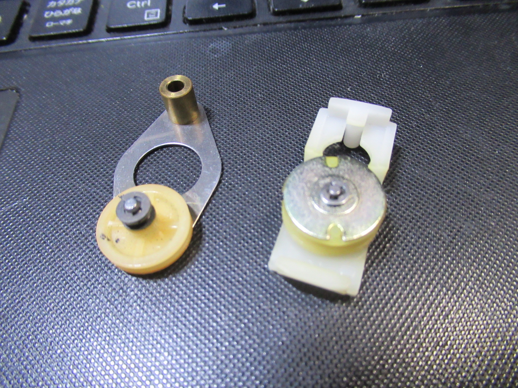 使用されていたのはOリングです。接地面積の関係から、一般的には丸ゴムはアイドラーには使用されませんが、おそらく、元々が特殊な形状のゴムリングだったため、やむを得ずの処置だったと推測されます。