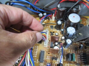 過去に機器底面が浸水した経緯があるということでしたので、AMTSのソレノイドのコネクタを抜いて導通を確認しましたが正常でした。回路図を眺めていると、メカをコントロールしているICの故障の可能性があると思い、そのICの取り付け箇所を探すことにしました。