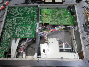カバーを開けます。AMTSの動作自体は、スイッチとトランジスタ、ソレノイドの組み合わせという簡単な回路ですが、テープ走行もしないということになると話が違います。
