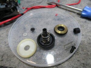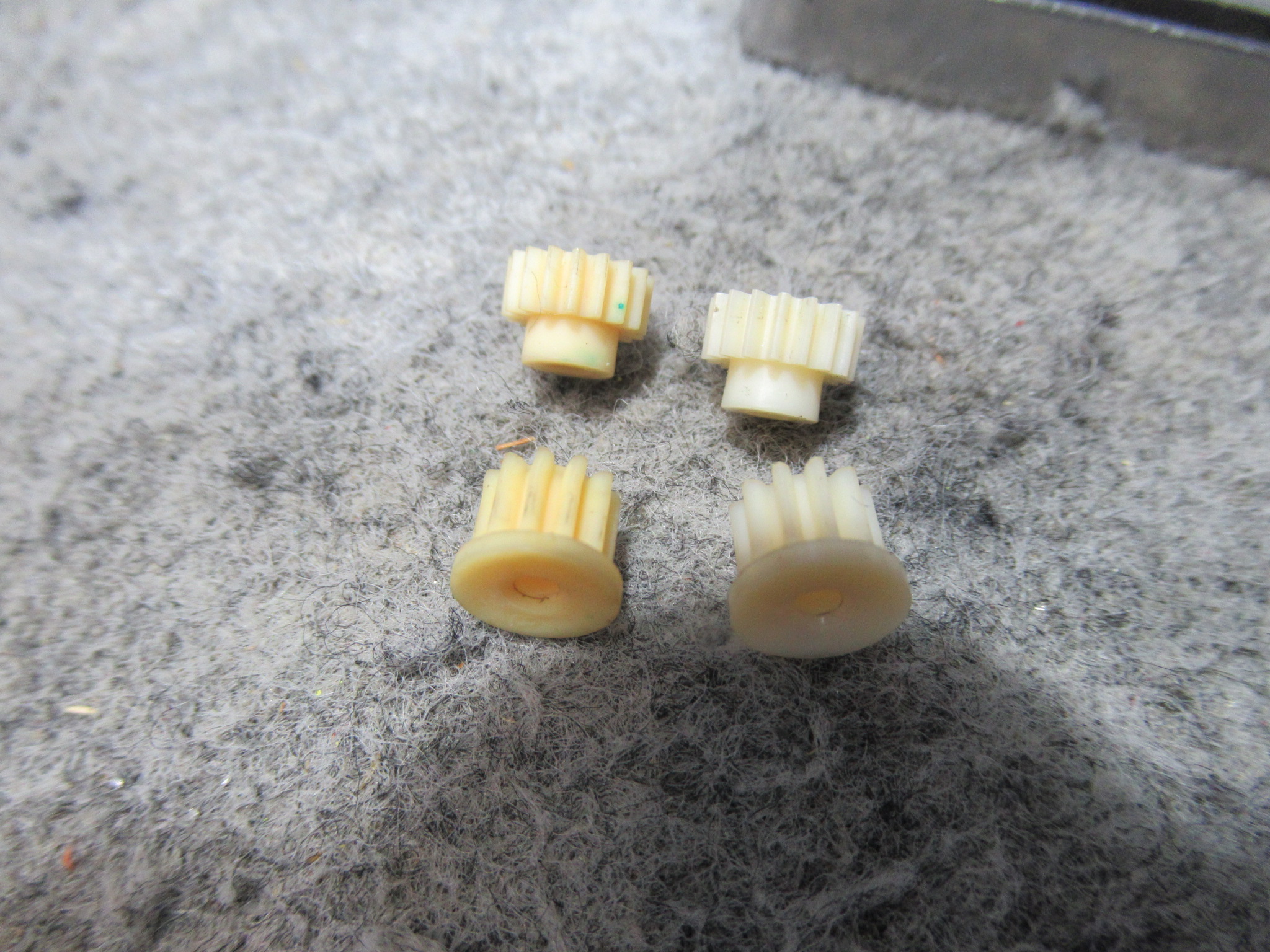 この機種のモーターのピニオンギヤは、材質の異なる2種類が存在します。色の濃いタイプは破損しやすいタイプですが、この機体は破損しにくいタイプが使用されていましたので問題ありません。