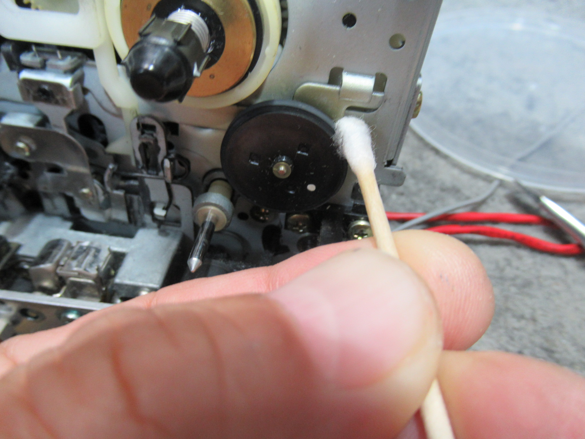 ヘッド周りを点検します。ヘッドもそうですが、特に左側のキャプスタンの汚れが気になりますので、アルコール清掃します。