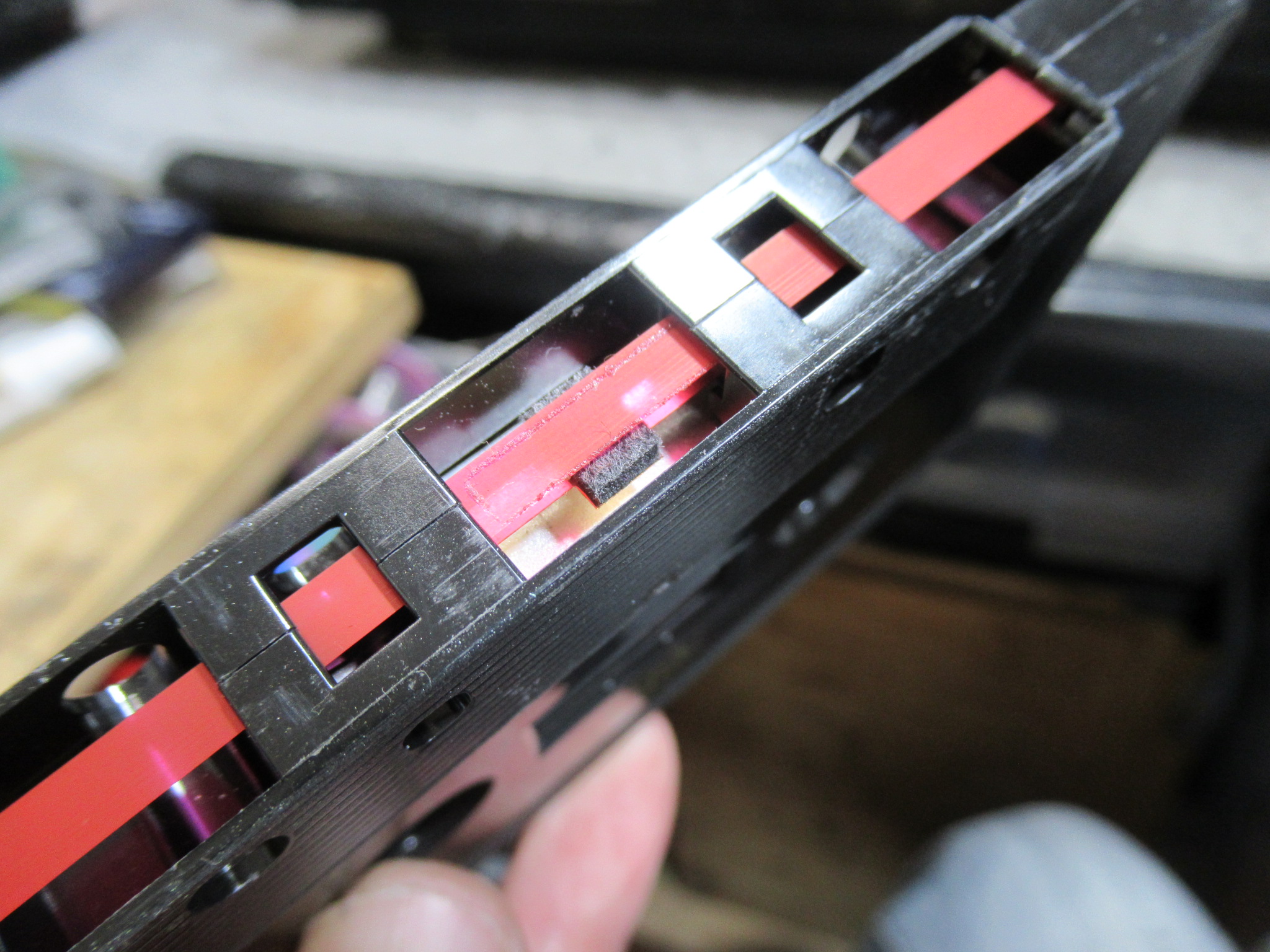 テープの表面を確認すると、何かの汚れが付着していました。これが原因でヘッドに貼り付いたようです。古いテープやミュージックテープはこういったトラブルが起こりやすいので注意が必要です。
