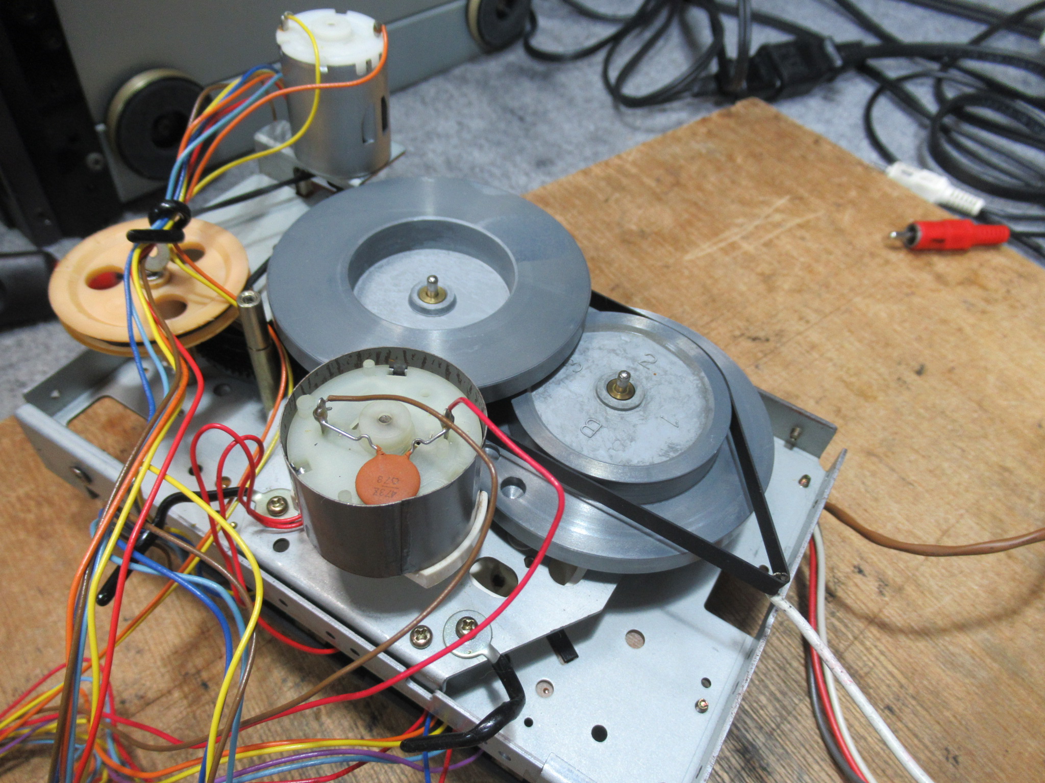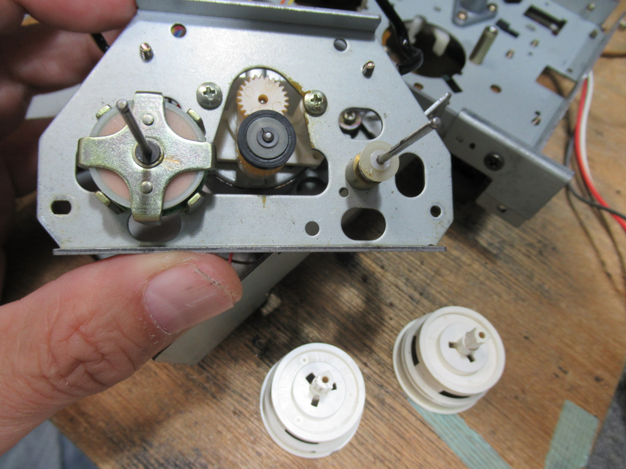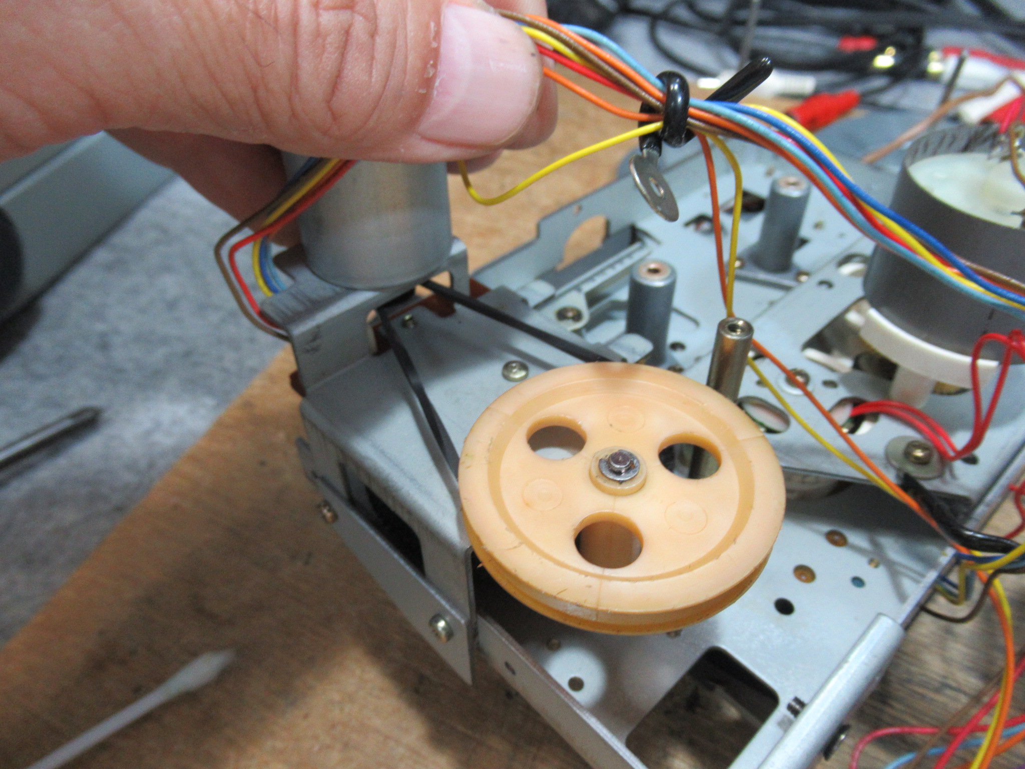 無くなっていたキャプスタンベルトは、加水分解で柔らかくなって切れて、モータープーリーに巻き付いていました。