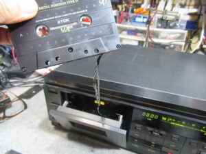 当店で電源を入れたところ、「ガチャガチャ」といって操作可能になりましたので、閉じ込められていたテープを救出しました。