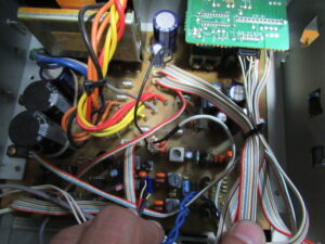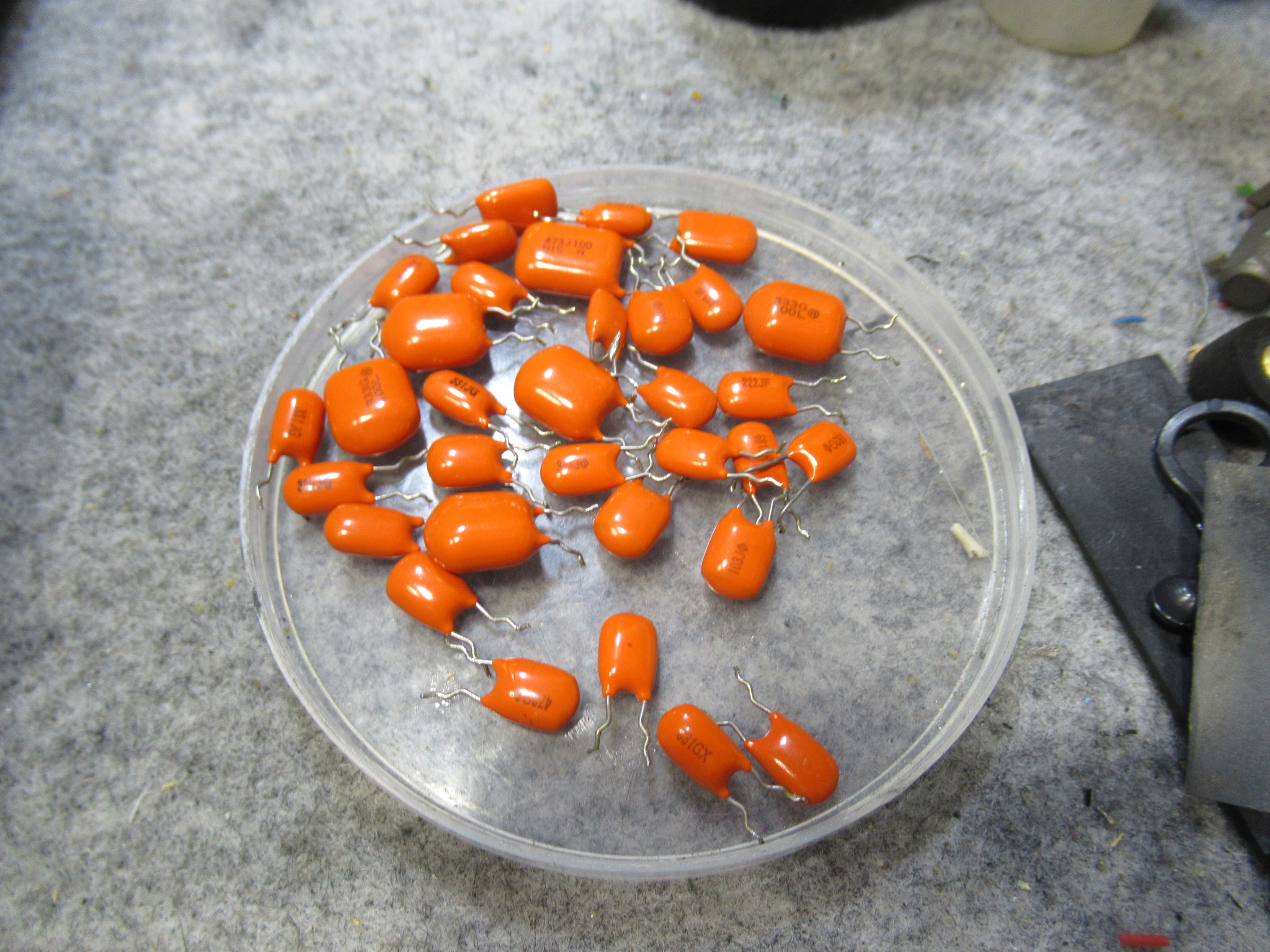 これが取り外したオレンジ色のフィルムコンデンサー、いわゆる「オレンジキャップ」です。一般的にフィルムコンデンサーは、電子部品の中でも劣化しにくい部類に入りますが、このタイプは非常に劣化しやすく、ノイズが発生したり、音質が低下したりと、かなりのトラブルメイカーです。