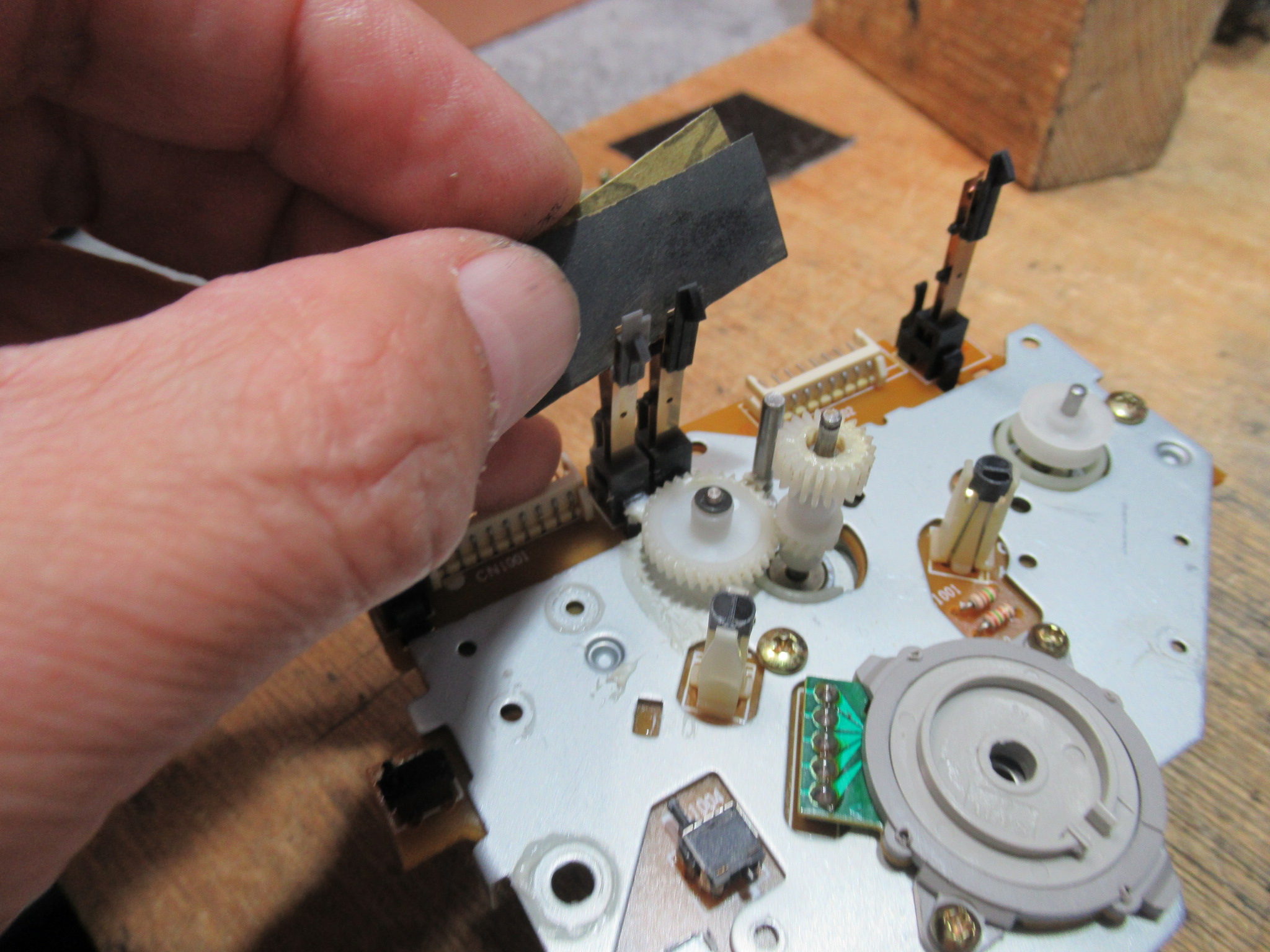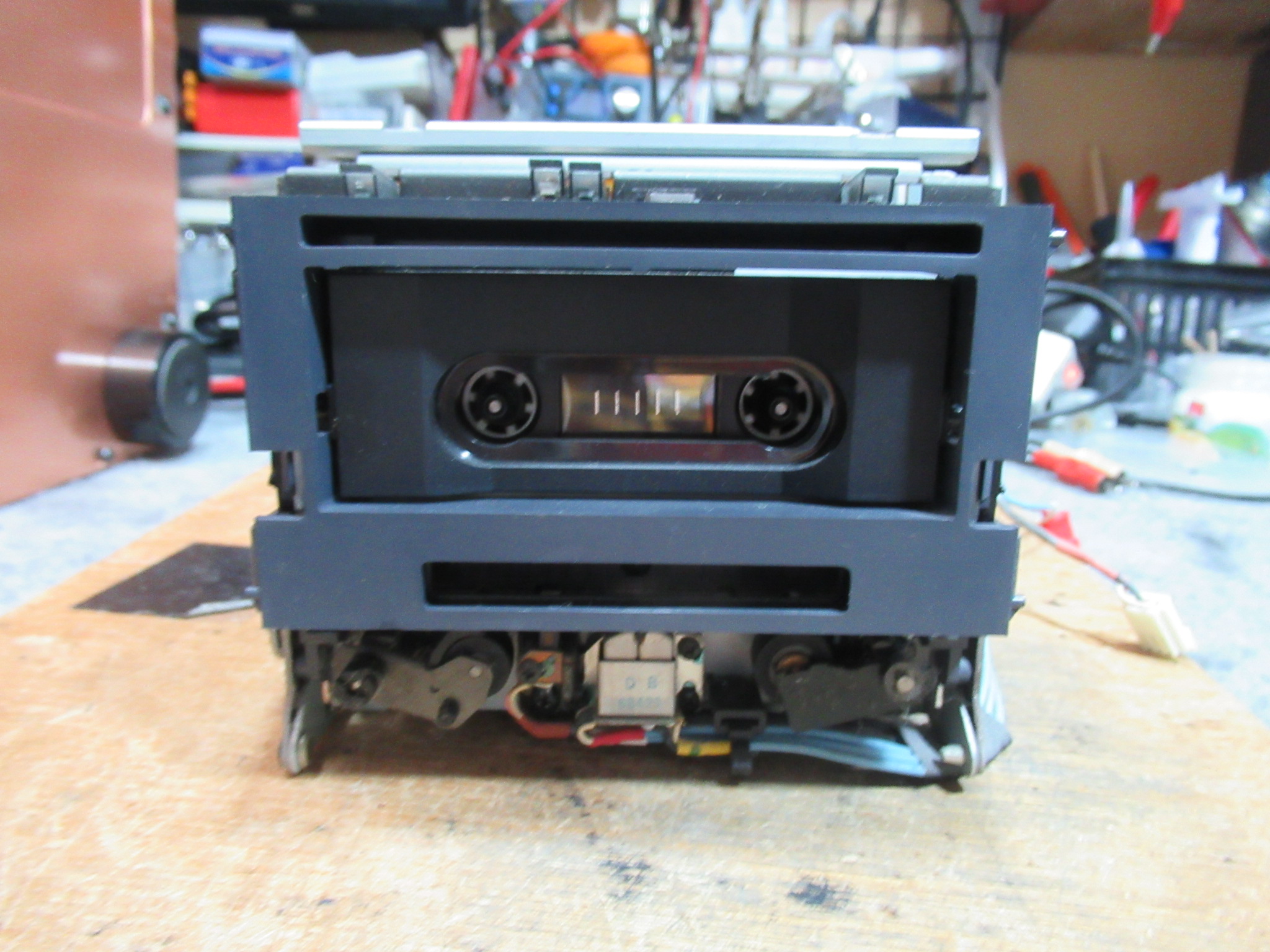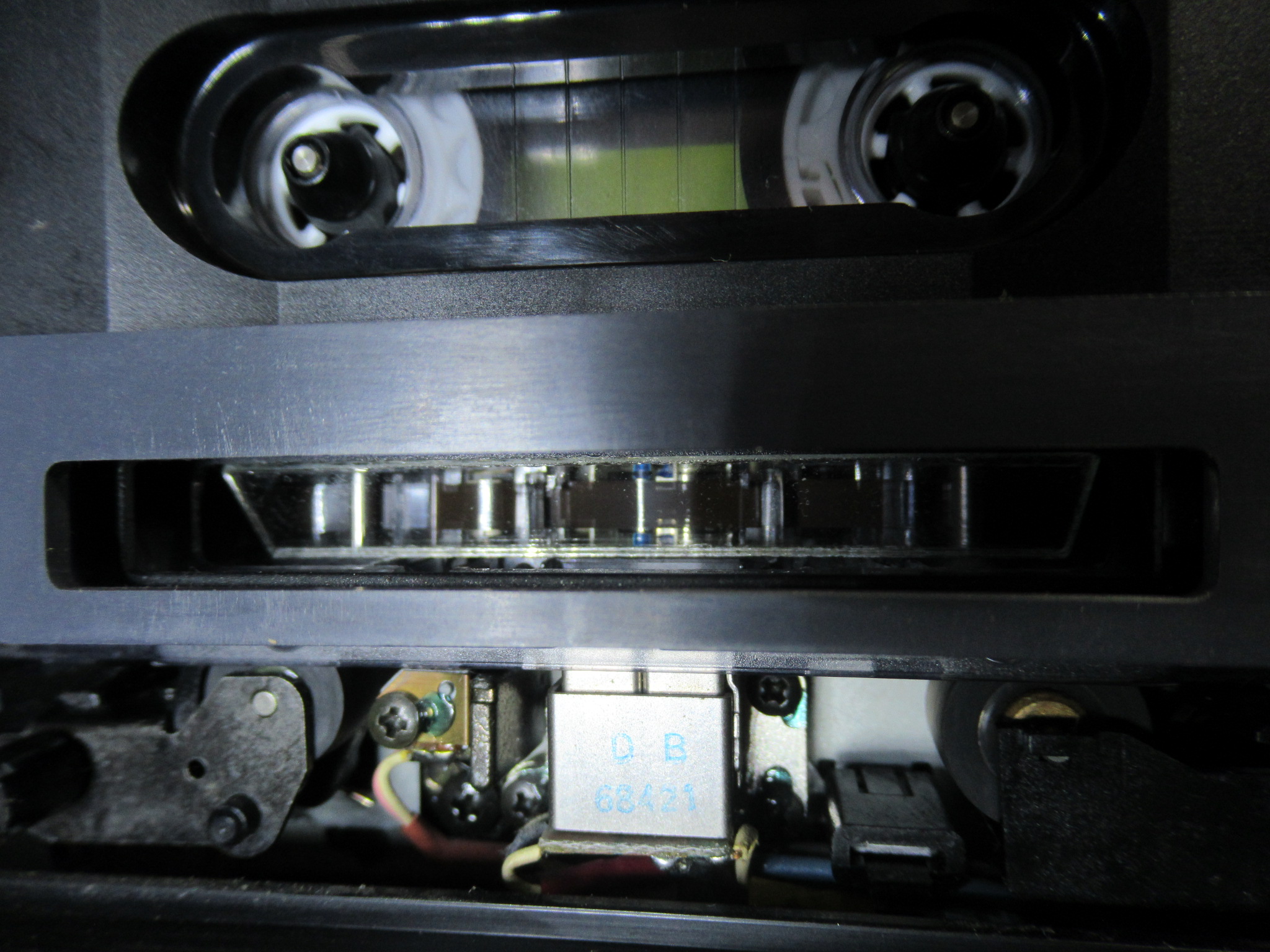 元通り組み立てて調整等に移ります。ミラーカセットを用いてテープの走行状態を目視点検します。
