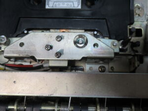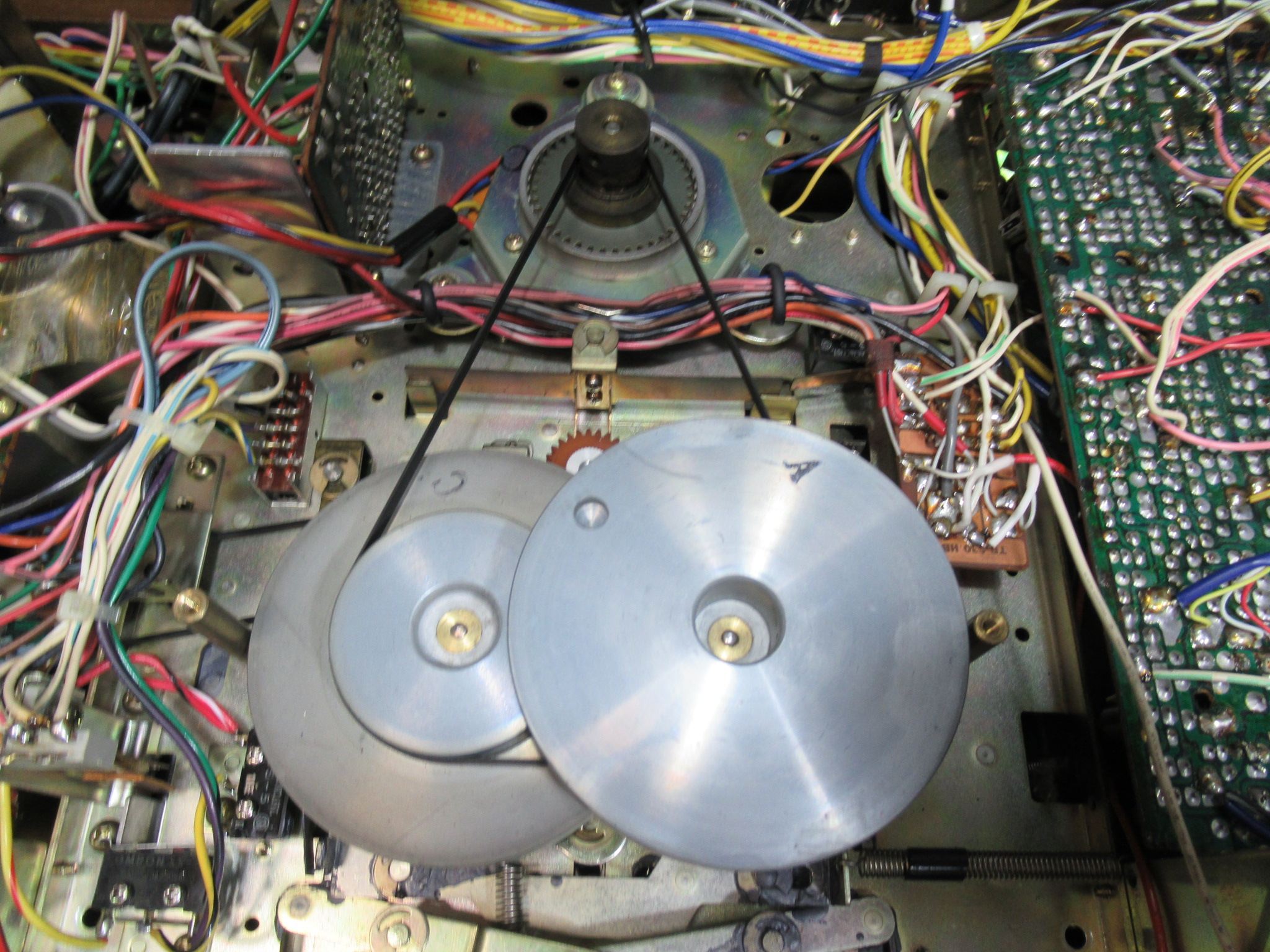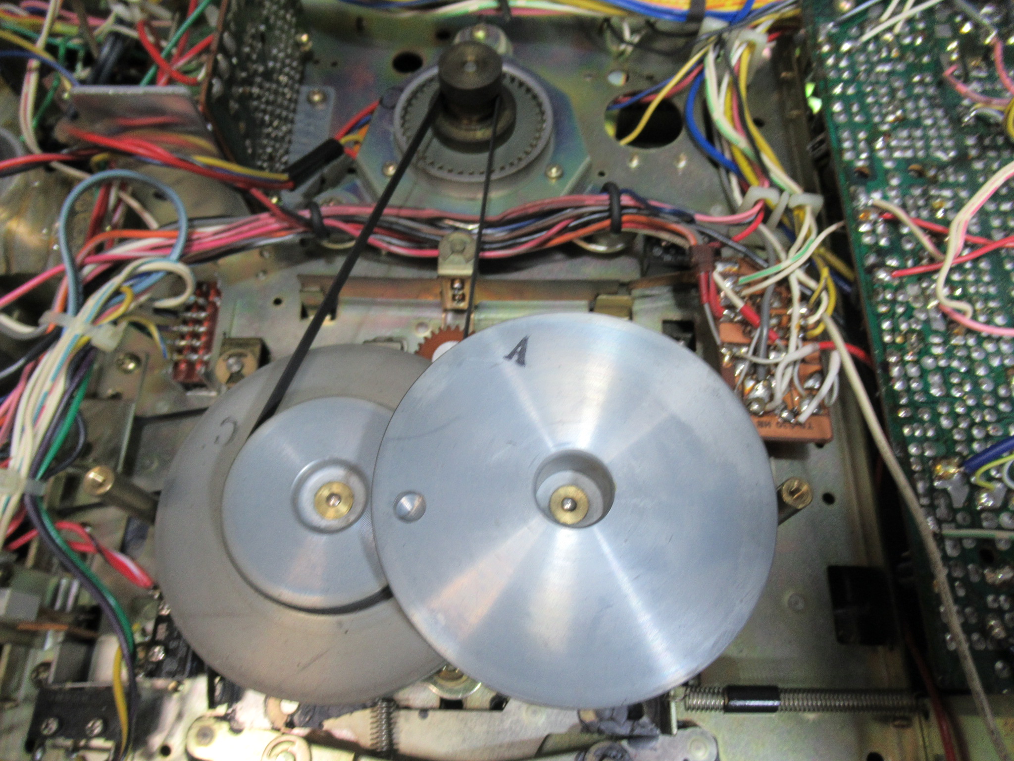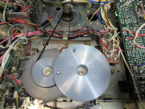 キャプスタンベルトの掛け方が間違っていました。右写真が正常な状態です。ただし、切れていたリールベルトと劣化していたカウンターベルトは交換しました。なお、アイドラーゴムも数か所使用されていましたが、手持ちに適当なサイズのものが無かったため、今回は、表面を軽く研磨し、専用クリーナーで処理して再利用します。