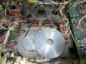 底板を取り外しました。メカニズムはオープンデッキの技術を流用して設計されています。事前のお話しではベルト2本が切れているということでしたが、