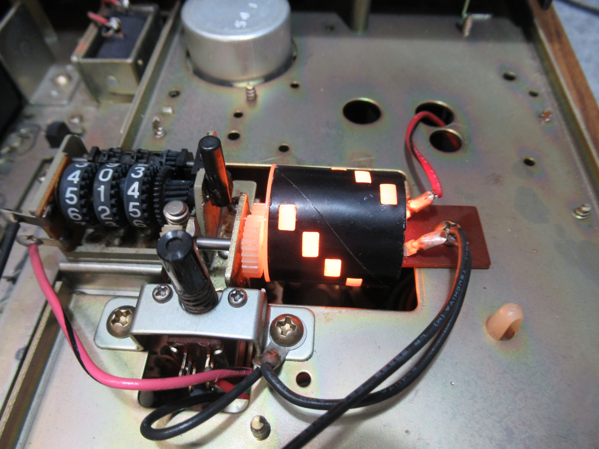真ん中の筒状のものは、カウンターに接続されていて、走馬灯のように回転します。最初は動作していませんでしたが、シャフト部の固着を解消し、切れていたランプを交換しました。